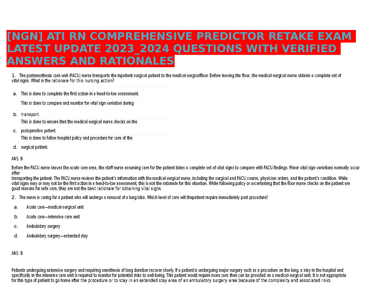 ATI RN Comprehensive Predictor Retake Exam: Latest 2023-2024 Questions with Verified Answers and Rationales by NGN