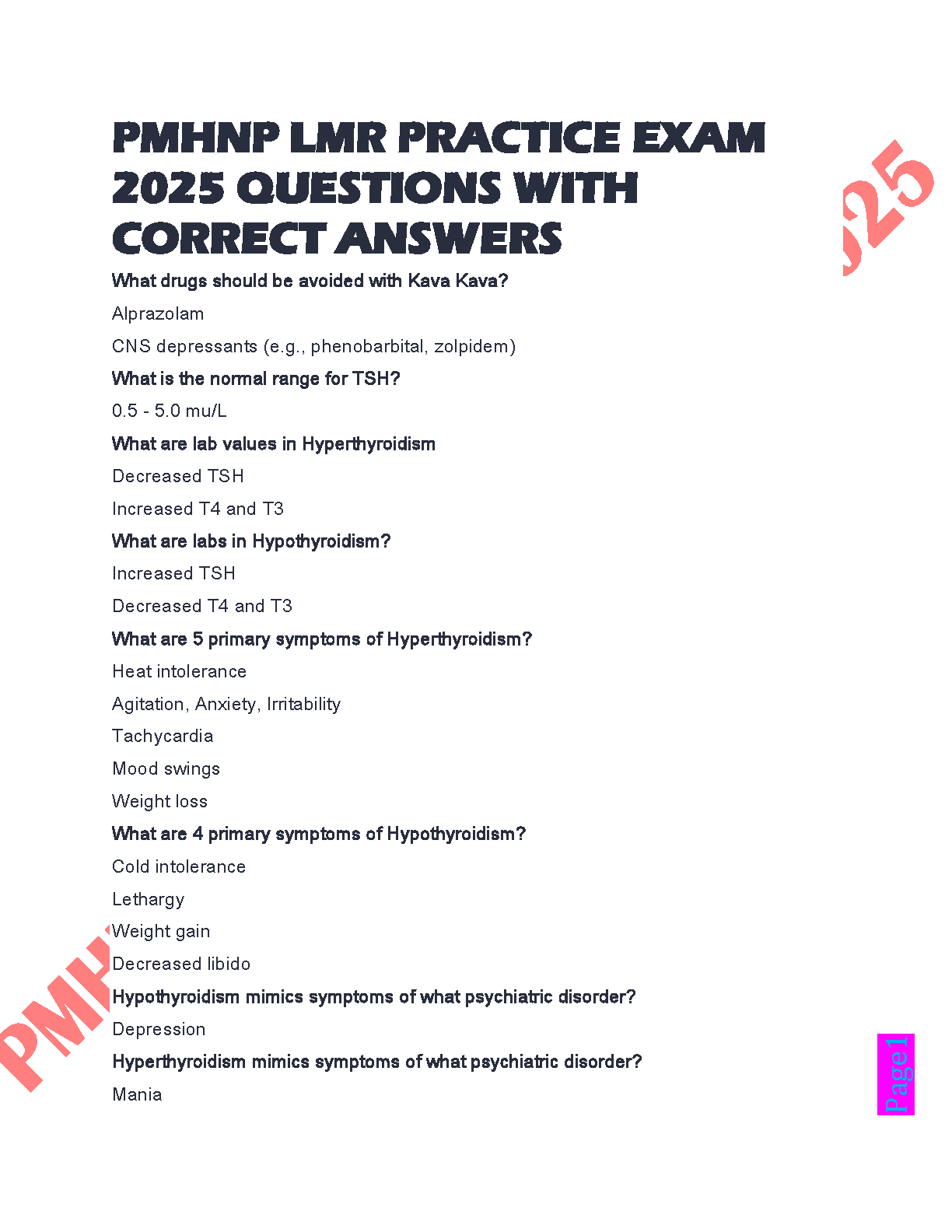 Prepare for your 2025 PMHNP LMR exam with this comprehensive practice exam featuring questions and correct answers. This resource is designed to help students ace their exams on the first try, eliminating the need for resits. Topics covered include drug interactions, lab values in thyroid disorders, and psychiatric symptom mimicry.
