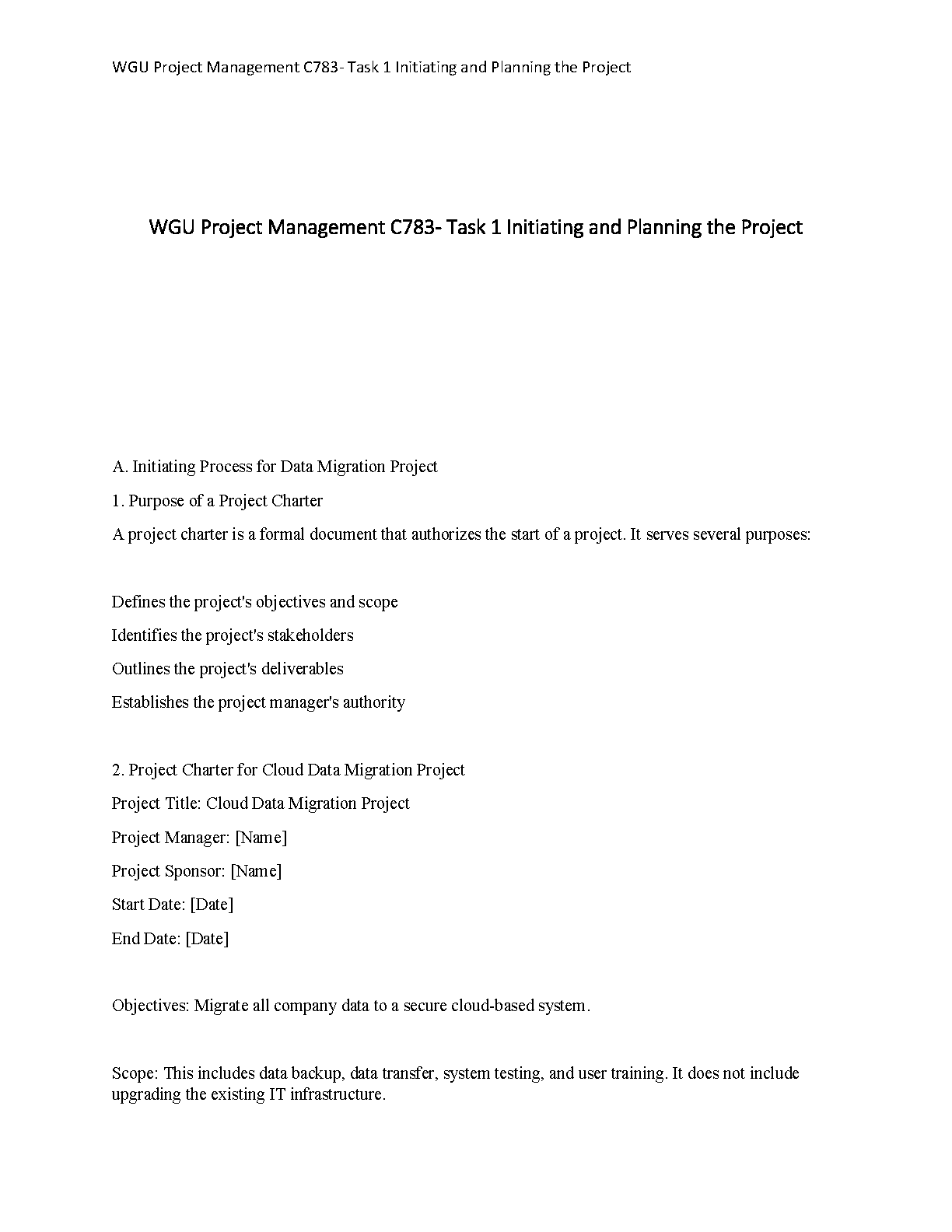 Master WGU's Project Management C783 Task 1 with this comprehensive guide. Learn how to initiate and plan a cloud data migration project, covering project charters, objectives, stakeholders, deliverables, and more. Ace your exam on the first try and avoid resits with this essential resource, designed for the 2024/2025 academic year.