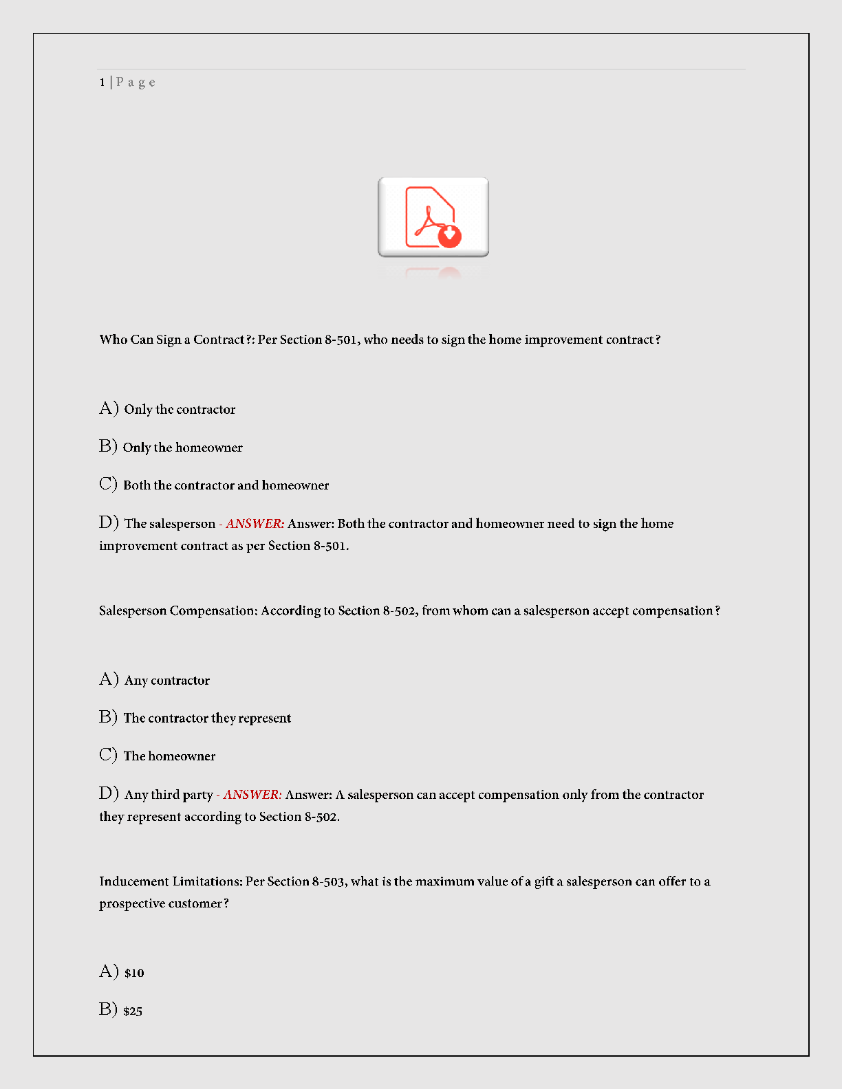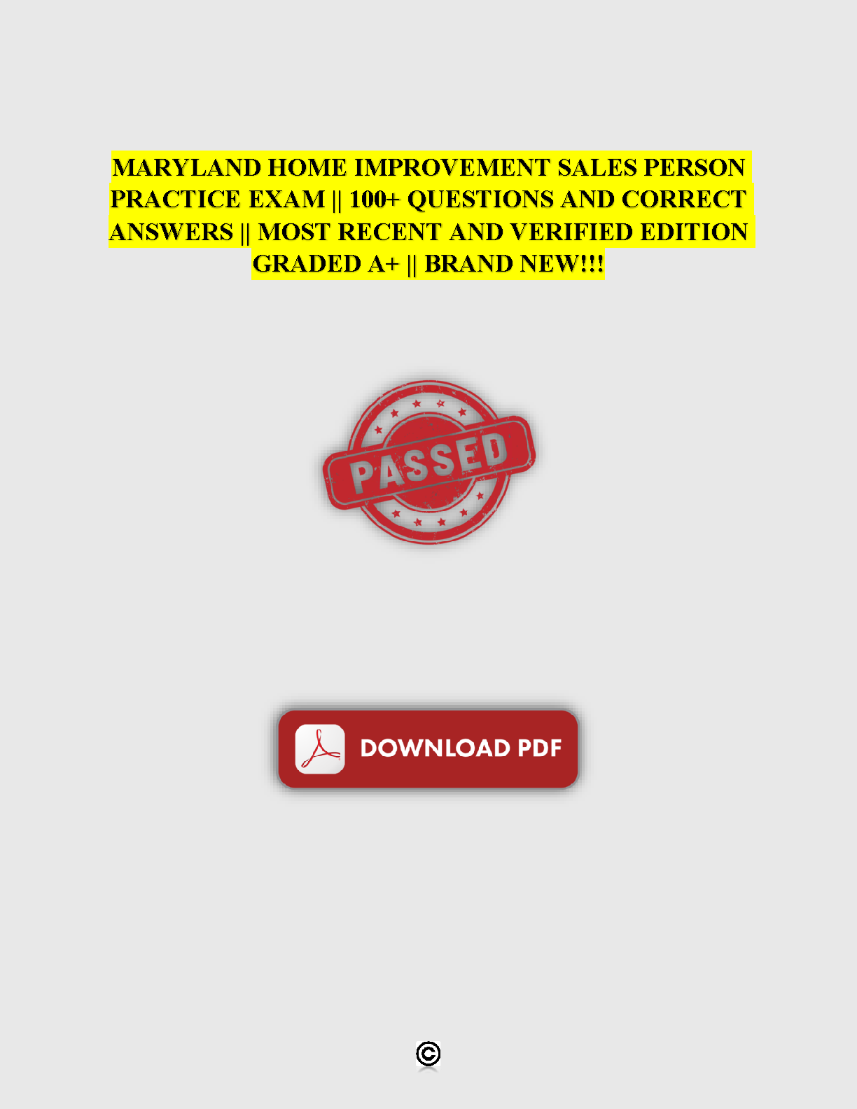 Ace your Maryland Home Improvement Salesperson exam with this comprehensive practice test. Featuring 100+ questions and verified answers based on the most recent edition, this resource guarantees a thorough preparation. Boost your confidence and pass on your first attempt!