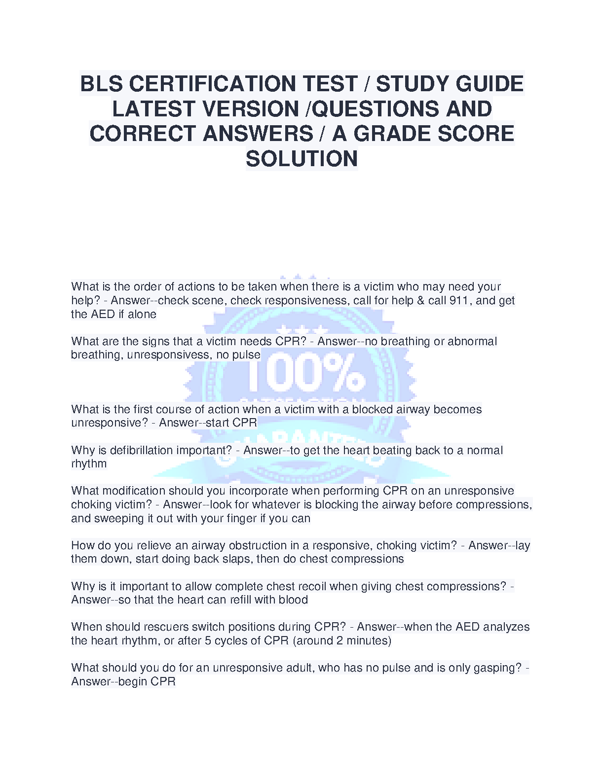 BLS Certification Test Study Guide: Latest Version Questions and Correct Answers for a Grade Score Solution