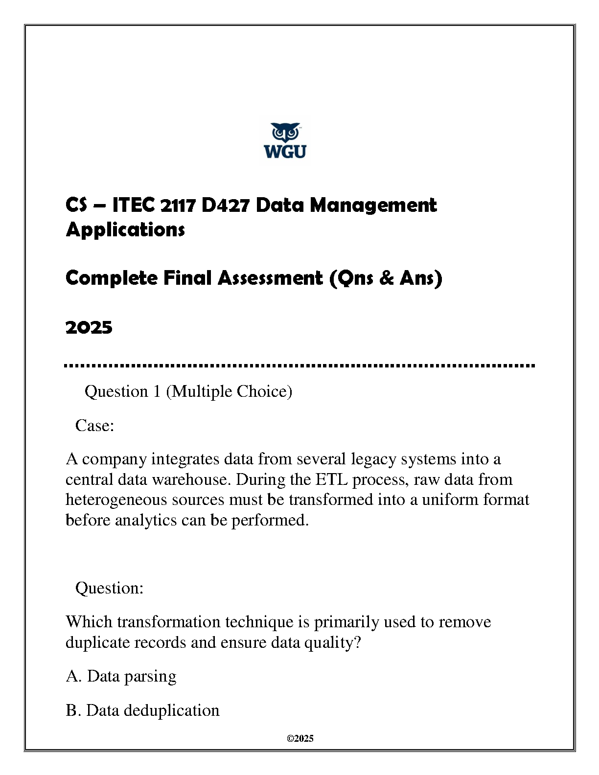 Ace your WGU CS - ITEC 2117 D427 Data Management Applications final exam with this comprehensive solution guide. This resource provides answers to the complete final assessment, helping students achieve top marks and avoid resits. Prepare effectively for the 2025 academic year.