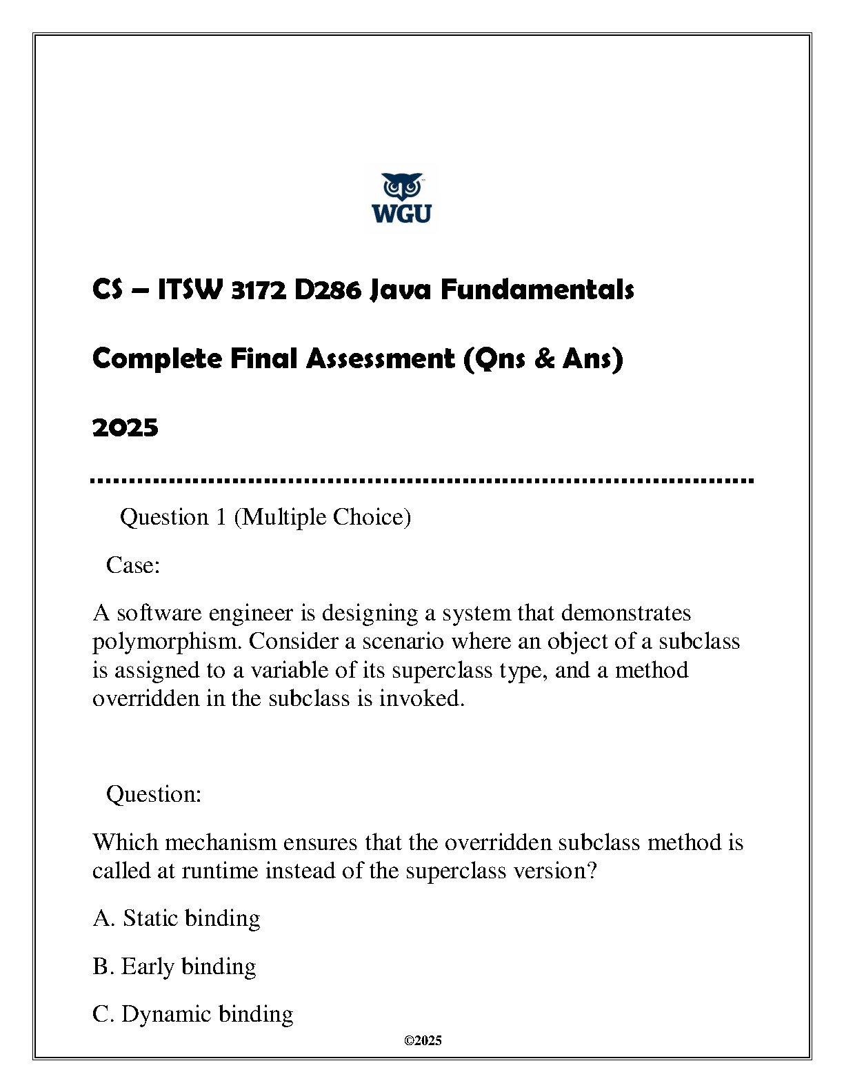 Ace your WGU Java Fundamentals final exam (ITSW 3172 D286) with this comprehensive assessment containing questions and answers. This resource is designed to help you pass your exam on the first attempt, avoiding costly resits. Prepare thoroughly and boost your confidence for exam success!