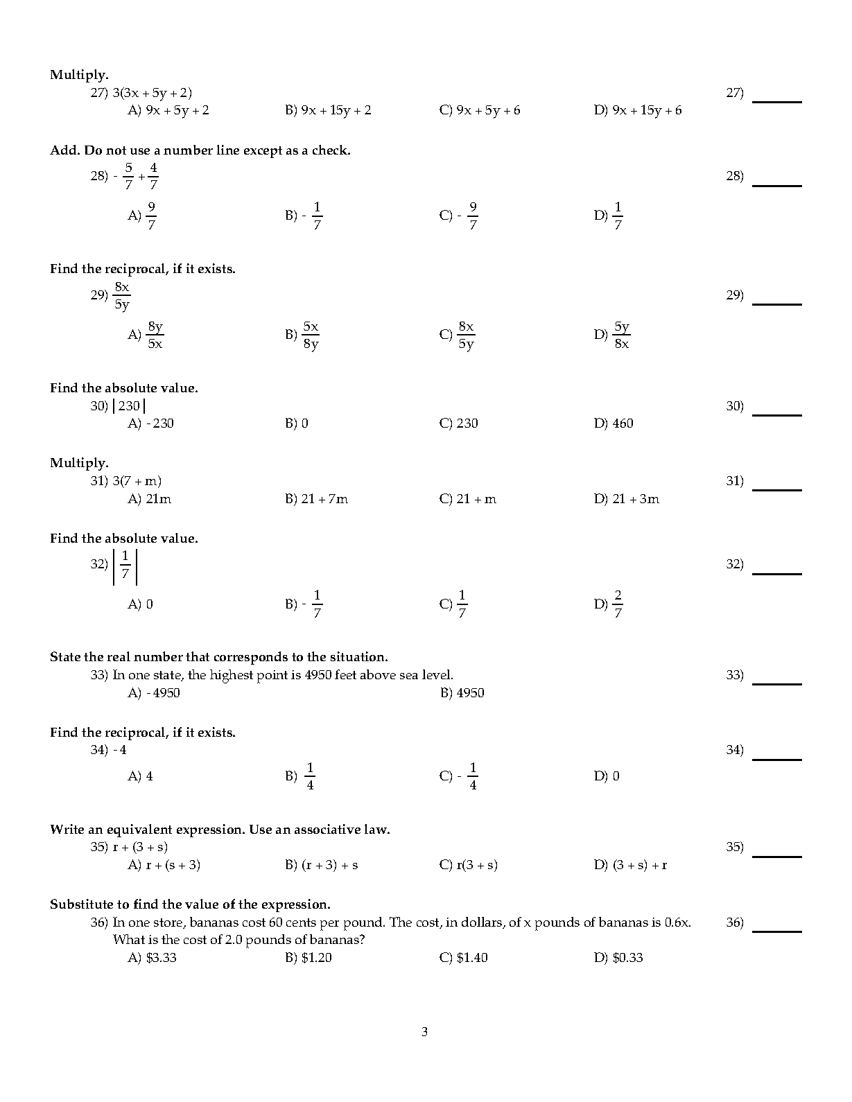Algebra Practice Problems: Multiple Choice and Short Answer Questions