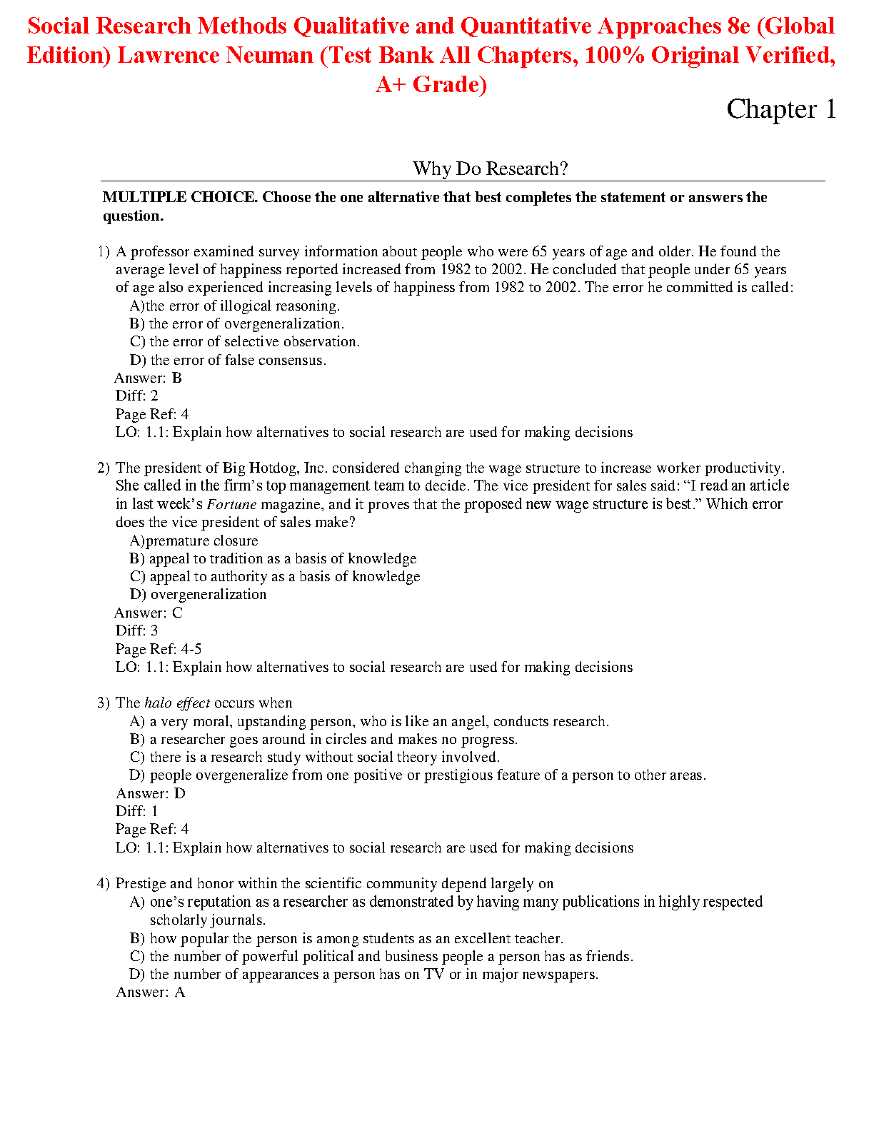 Ace your Social Research Methods exams with this comprehensive 8th edition test bank by Lawrence Neuman. This resource covers all chapters, providing 100% original verified questions to help you master the material and avoid resits. Perfect for the 2024/2025 academic year.