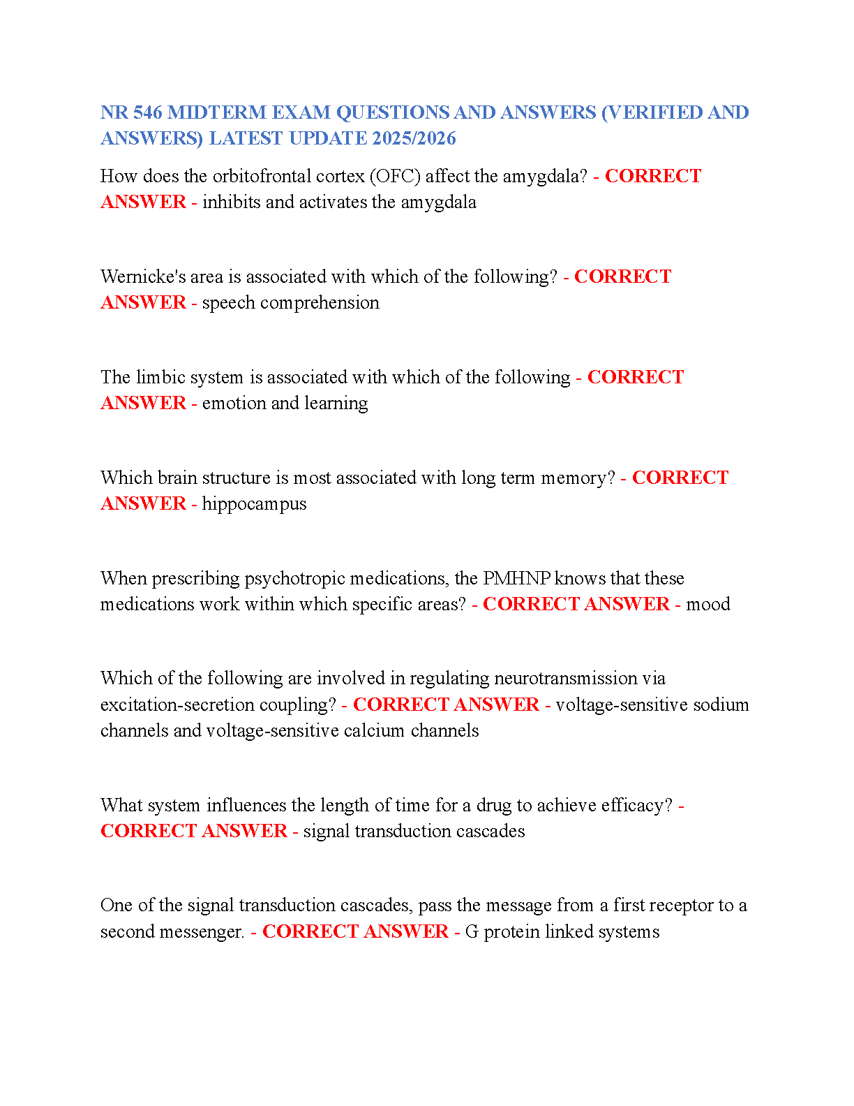 Ace your NR 546 midterm exam with this comprehensive guide featuring verified questions and answers, updated for the 2025/2026 academic year. This resource covers key concepts, ensuring exam success on your first attempt and avoiding resits. Master neurotransmission, signal transduction, and psychotropic medications. Prepare thoroughly for a higher score!
