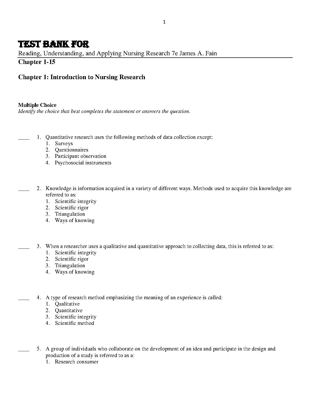 Test Bank for Reading, Understanding, and Applying Nursing Research 7th Edition by James A. Fain