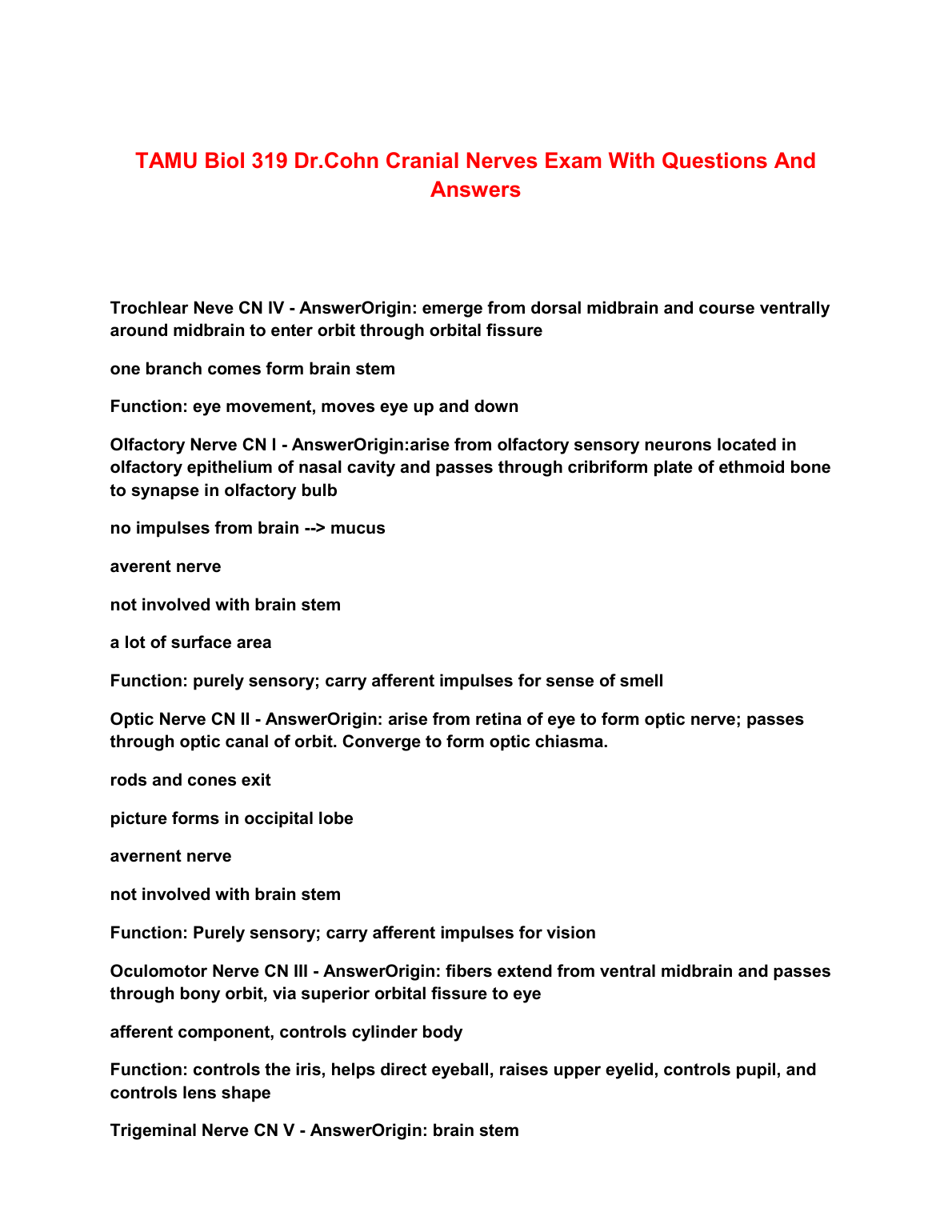 TAMU Biol 319 Dr.Cohn Cranial Nerves Exam With Questions And Answers COMPLETE SOLUTION RATED A+