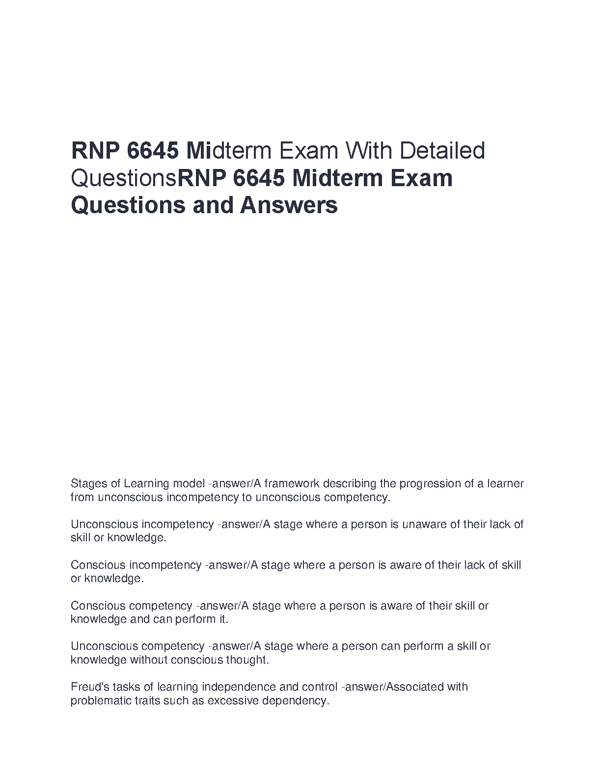 Ace your RNP 6645 midterm exam on your first attempt with this comprehensive guide. This resource provides detailed questions and answers covering key concepts, including the Stages of Learning model and Freud's tasks of learning, ensuring exam success and avoiding resits. Perfect for the 2024/2025 academic year.