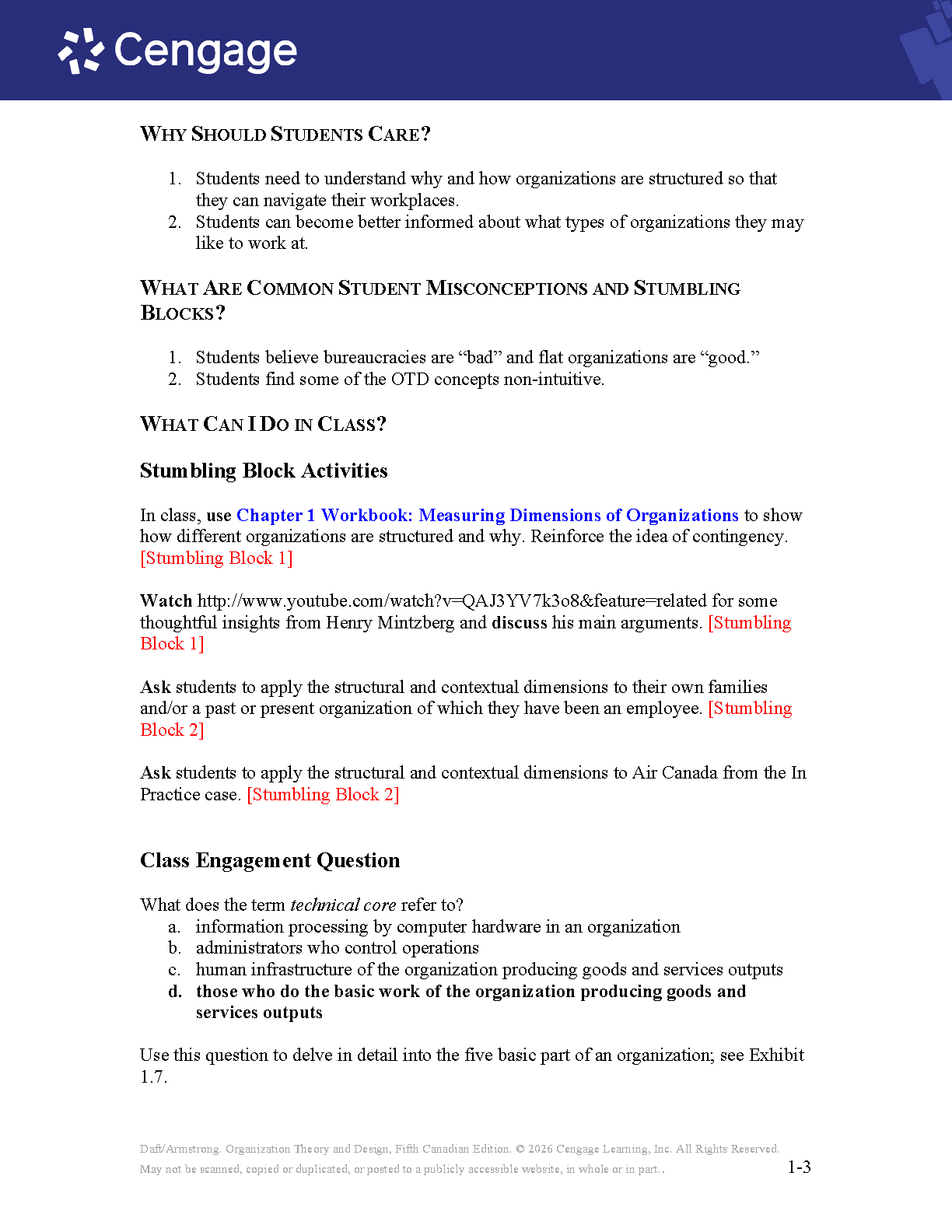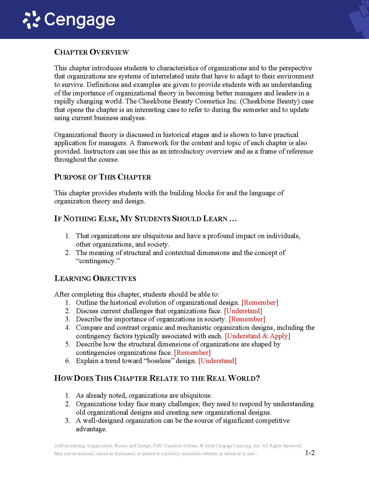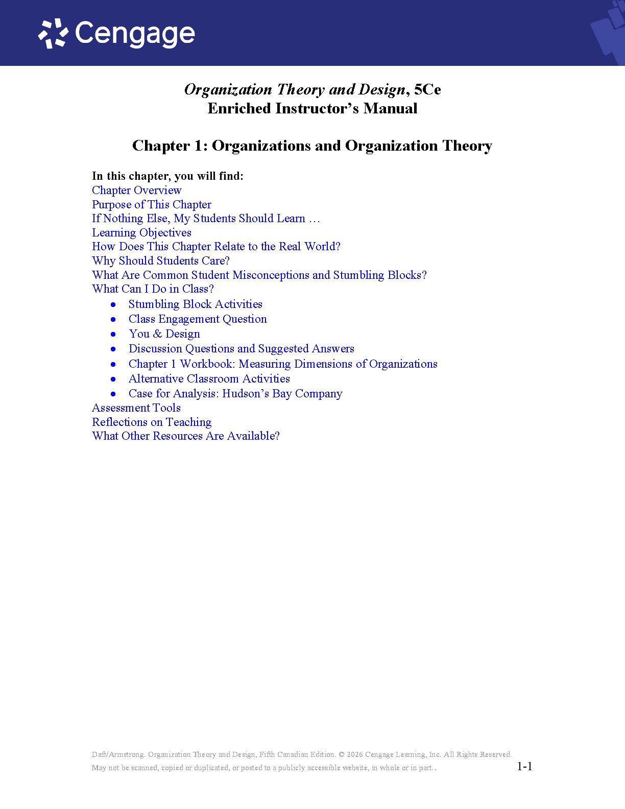 This Enriched Instructor's Manual for Daft and Armstrong's Organization Theory and Design, 5th Canadian Edition, provides comprehensive resources to help instructors deliver engaging and effective lessons. It includes chapter overviews, learning objectives, real-world applications, discussion questions, and suggested answers, as well as additional activities and assessment tools. Prepare your students for exam success with this invaluable resource.