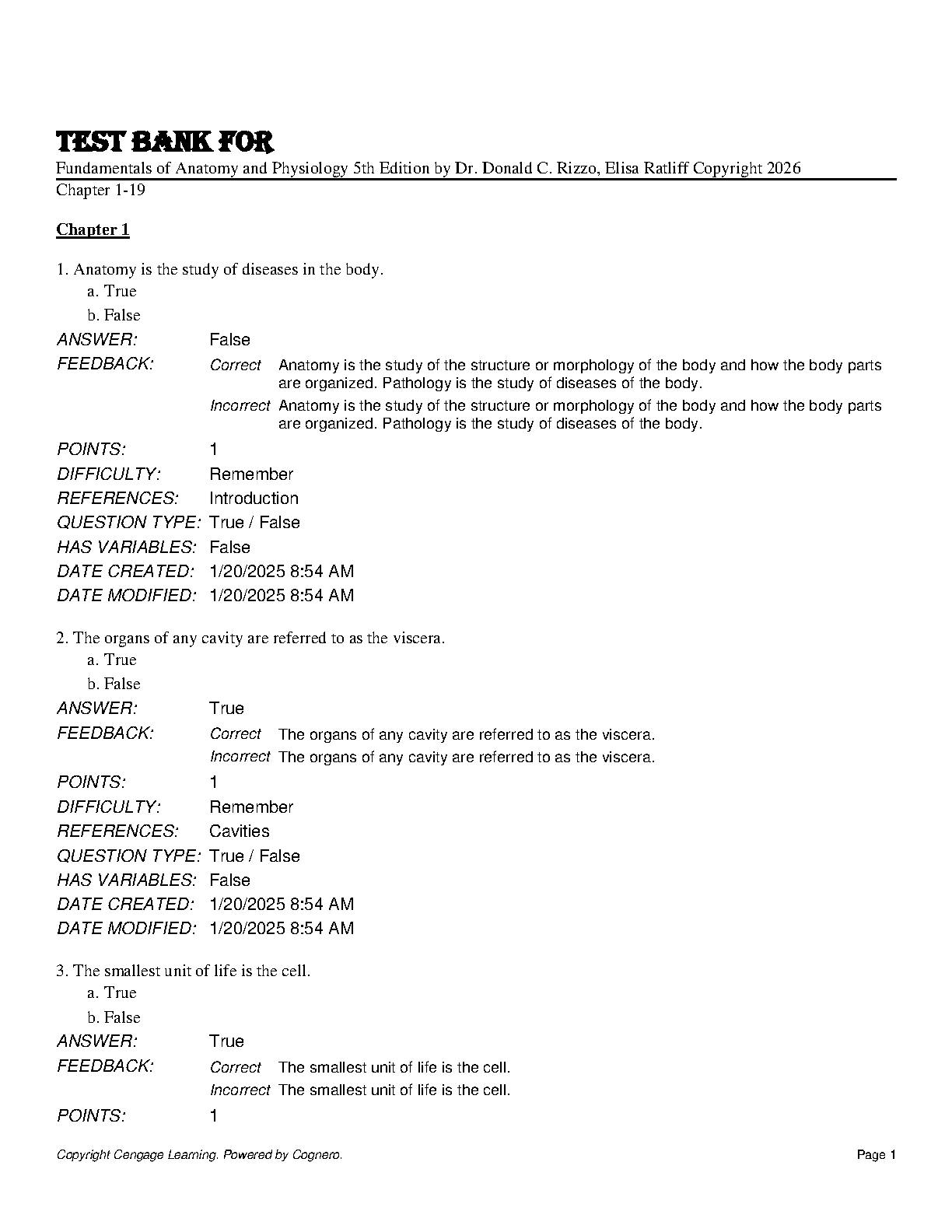Master Fundamentals of Anatomy and Physiology with this comprehensive 5th edition test bank by Donald C. Rizzo and Elisa Ratliff. Prepare effectively for exams, avoid resits, and achieve exam success on your first attempt. This resource provides a wealth of practice questions to solidify your understanding.