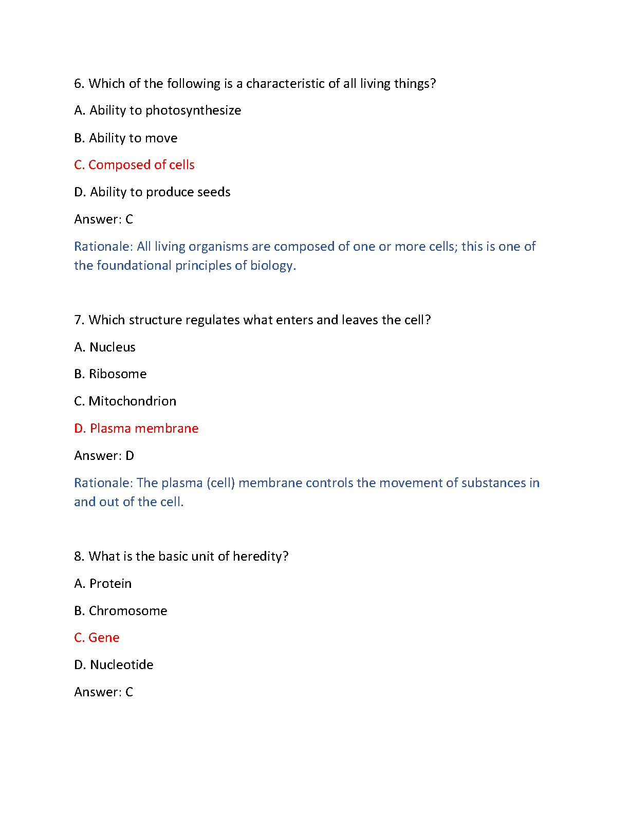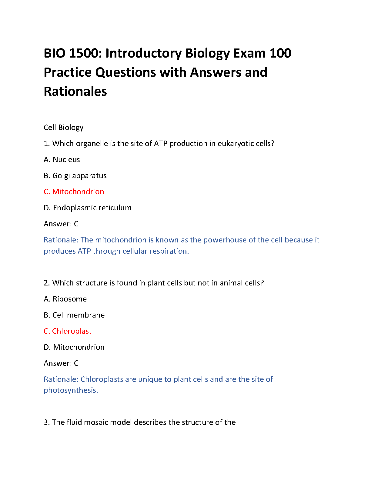 Ace your BIO 1500 Introductory Biology exam with this comprehensive set of 100 practice questions, complete with answers and rationales. Designed to help students master key concepts and achieve exam success on their first attempt. Perfect for 2024/2025 academic year.