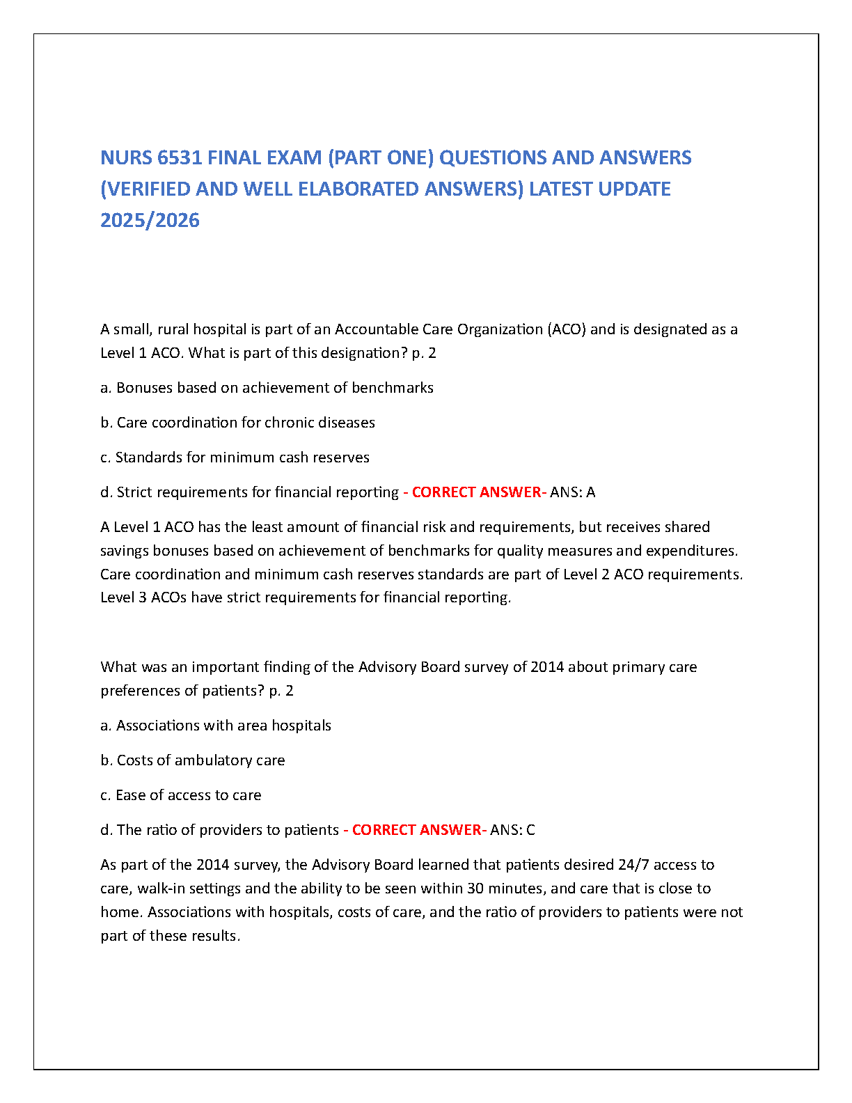 Ace your NURS 6531 final exam (Part One) with this comprehensive question and answer resource. This updated 2025/2026 edition provides verified and well-elaborated answers to help nursing students pass on their first attempt, avoiding costly resits. Prepare effectively and confidently for exam success.