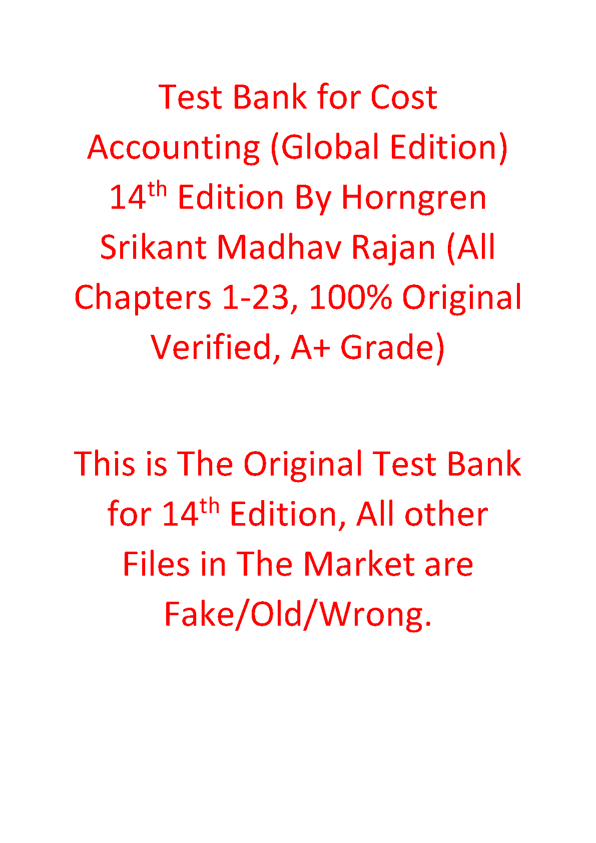 Ace your Cost Accounting exam with this verified 14th edition test bank by Horngren, Srikant, and Rajan. This original resource covers all 23 chapters, ensuring comprehensive exam preparation and helping you avoid resits. Guaranteed A+ grade material!