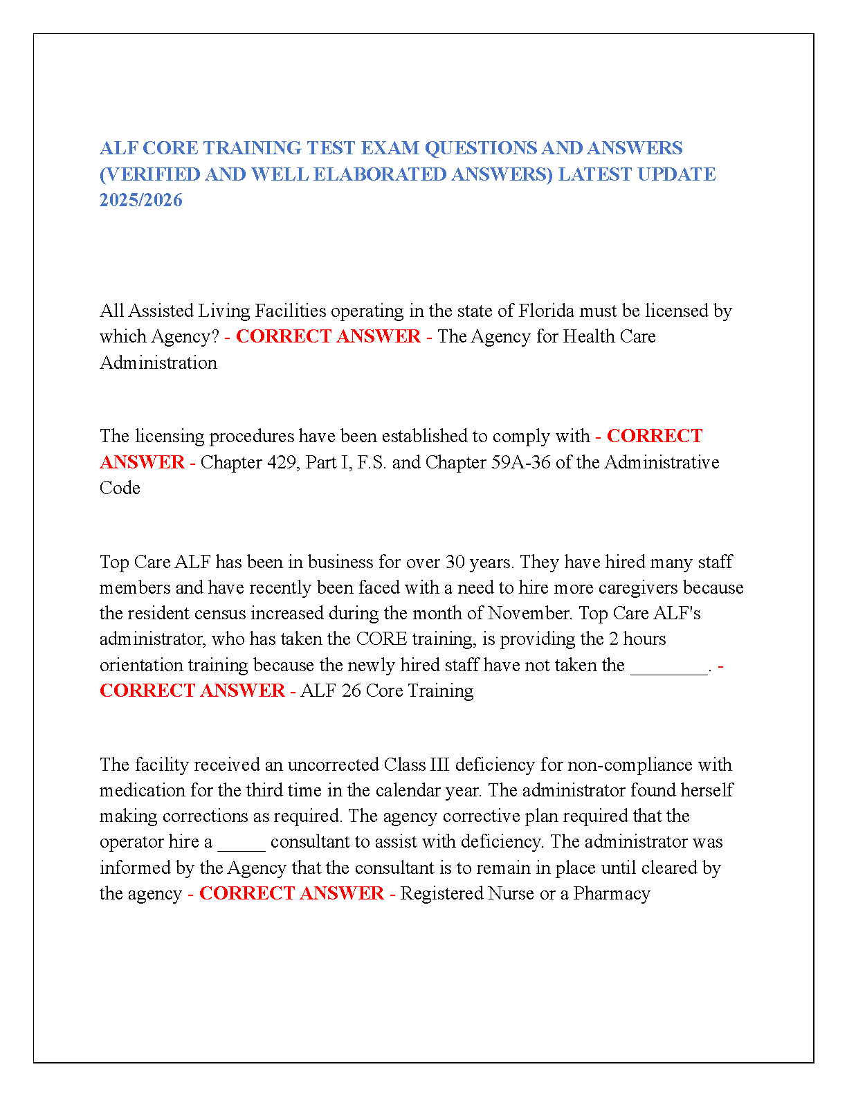 ALF Core Training Test Exam Questions and Answers 2025/2026 Edition: Verified and Well-Elaborated Answers for First-Attempt Exam Success