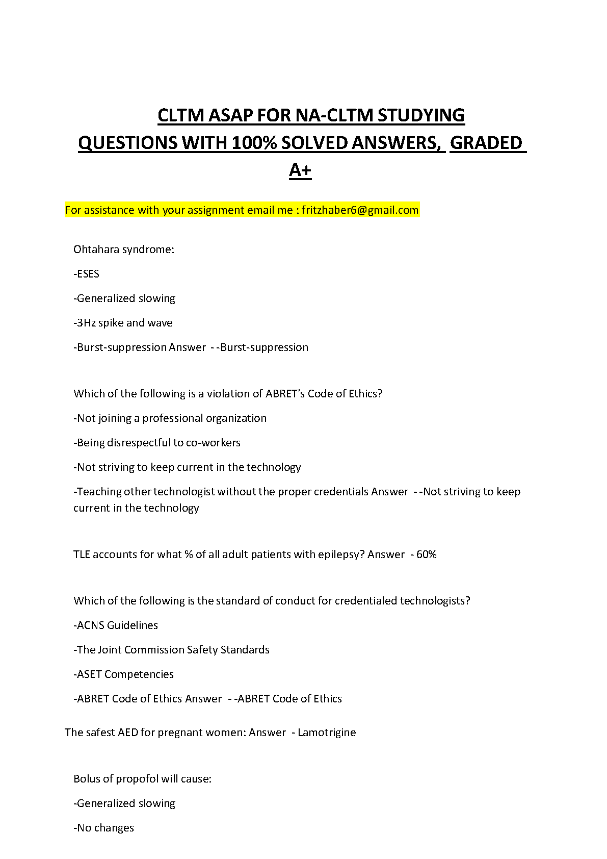 Ace your CLTM exam with this comprehensive study guide featuring 100% solved questions and answers, graded A+. This resource covers key concepts such as Ohtahara syndrome, ABRET's Code of Ethics, and epilepsy treatments. Prepare effectively and avoid resits! Perfect for the 2024/2025 academic year.