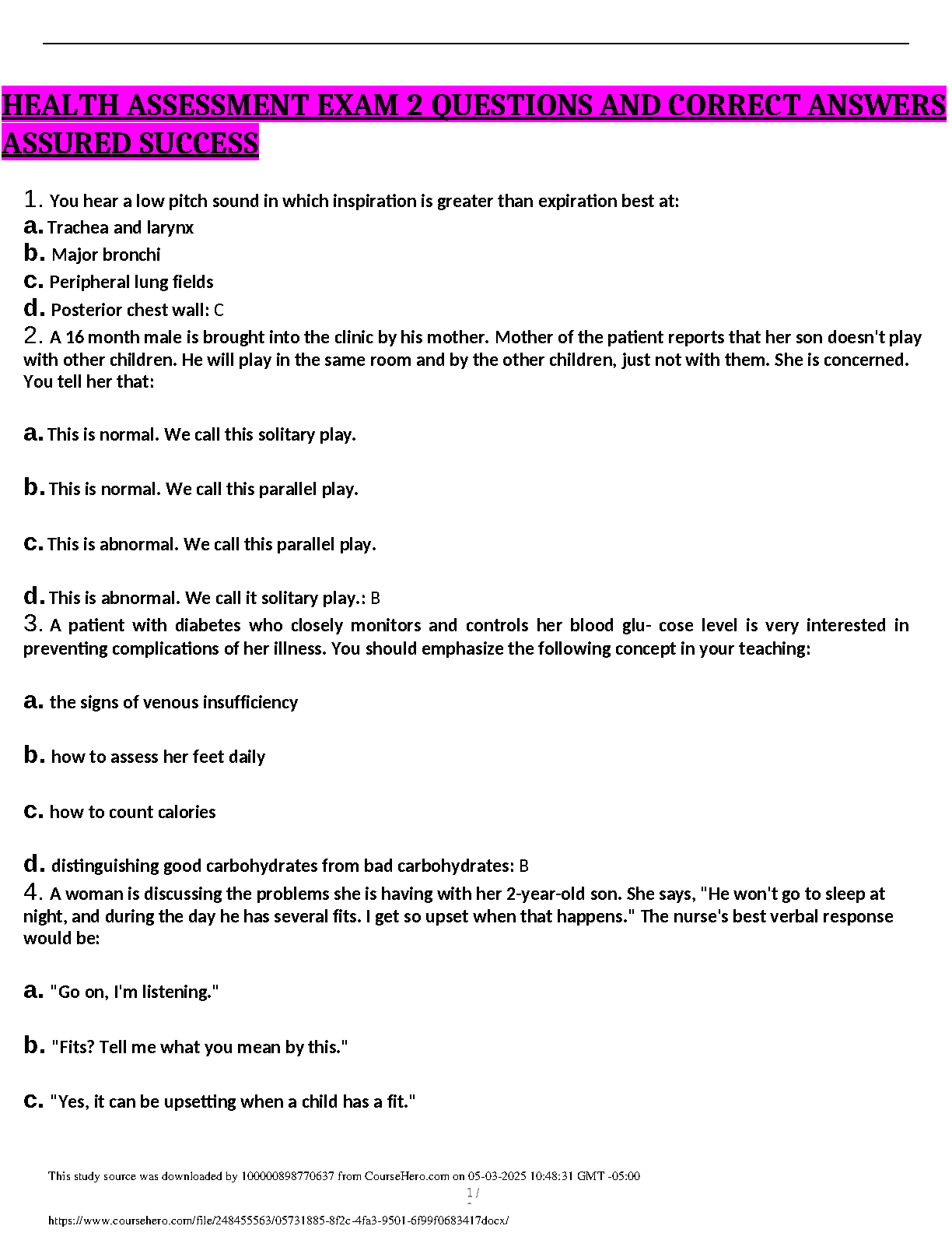 Ace your Health Assessment Exam with this comprehensive guide featuring questions and answers. This study resource is designed to help students master key concepts, improve exam performance, and avoid resits. Perfect for the 2024-2025 academic year.