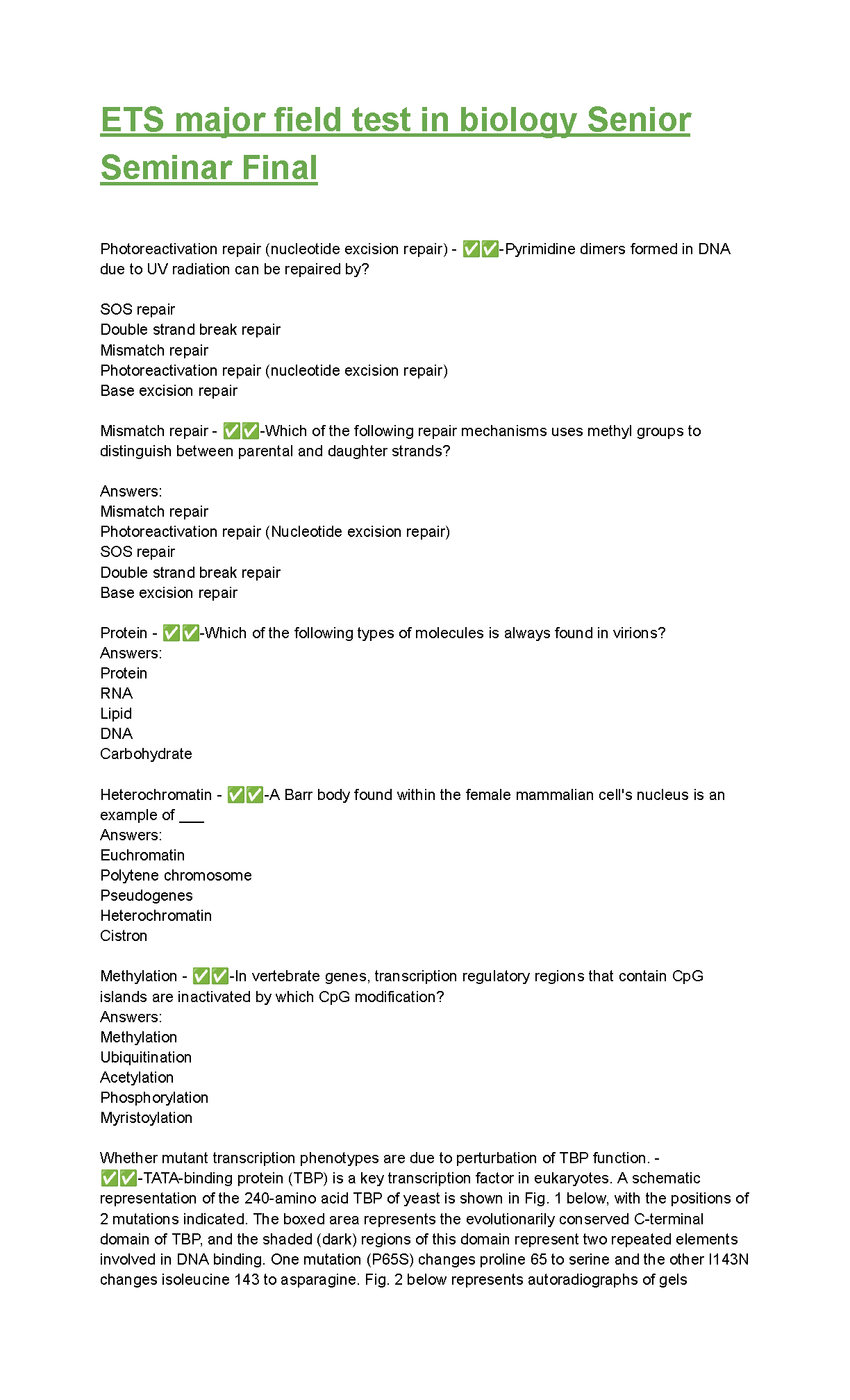 Ace your Biology Senior Seminar Final exam on the first try! This comprehensive study guide covers key topics such as DNA repair mechanisms, gene regulation, and more, ensuring exam success and avoiding resits. Prepare effectively for the 2024/2025 academic year.