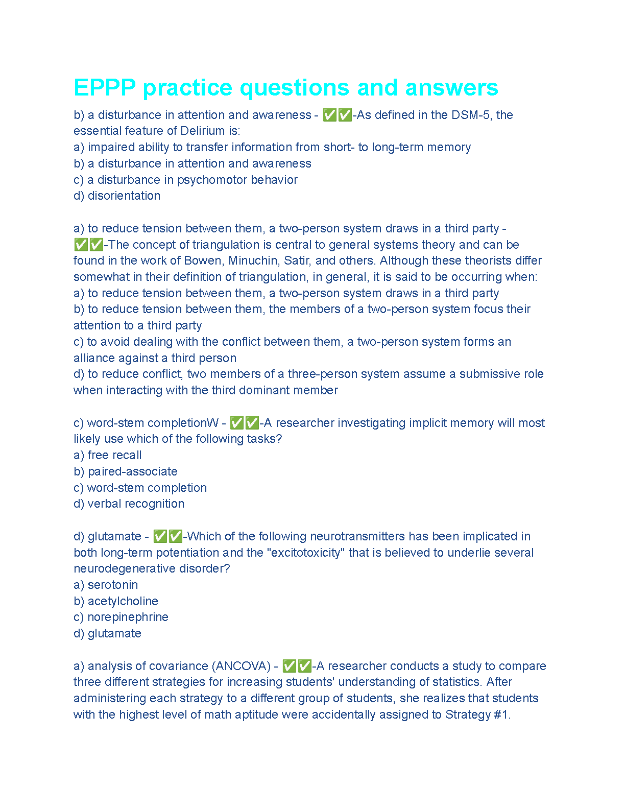 Prepare for the Examination for Professional Practice in Psychology (EPPP) with this extensive collection of practice questions and answers. This resource covers key concepts in psychology, helping you master the material and pass your exam on the first attempt. Boost your confidence and achieve your professional goals!
