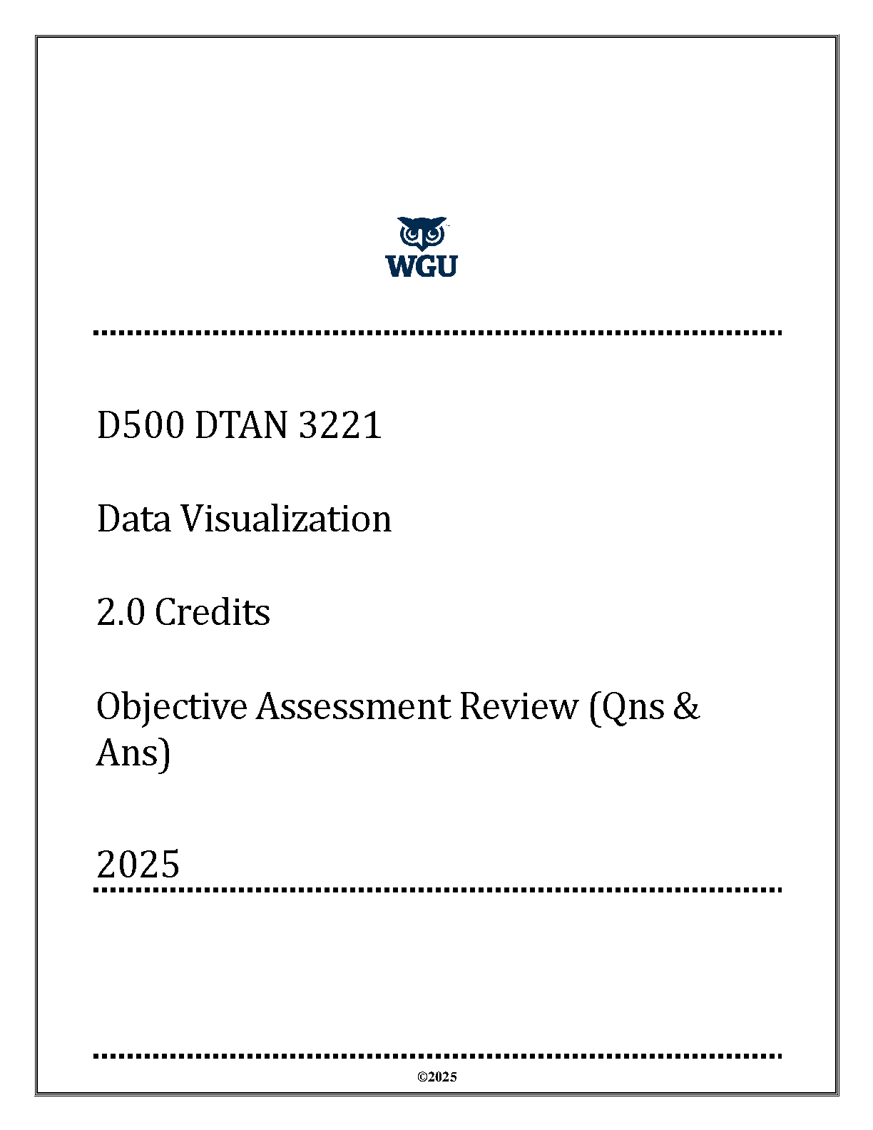 Ace your WGU D500 DTAN 3221 Data Visualization exam with this comprehensive 2025 objective assessment review. This resource provides questions and answers to help you master the material and pass on your first attempt, avoiding costly resits. Prepare effectively for success!
