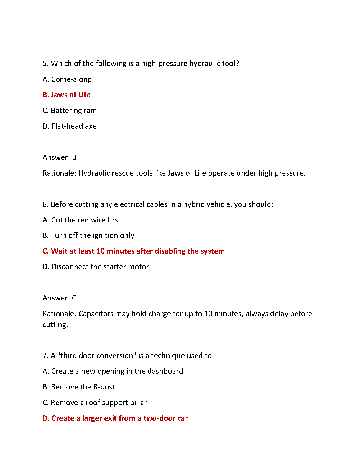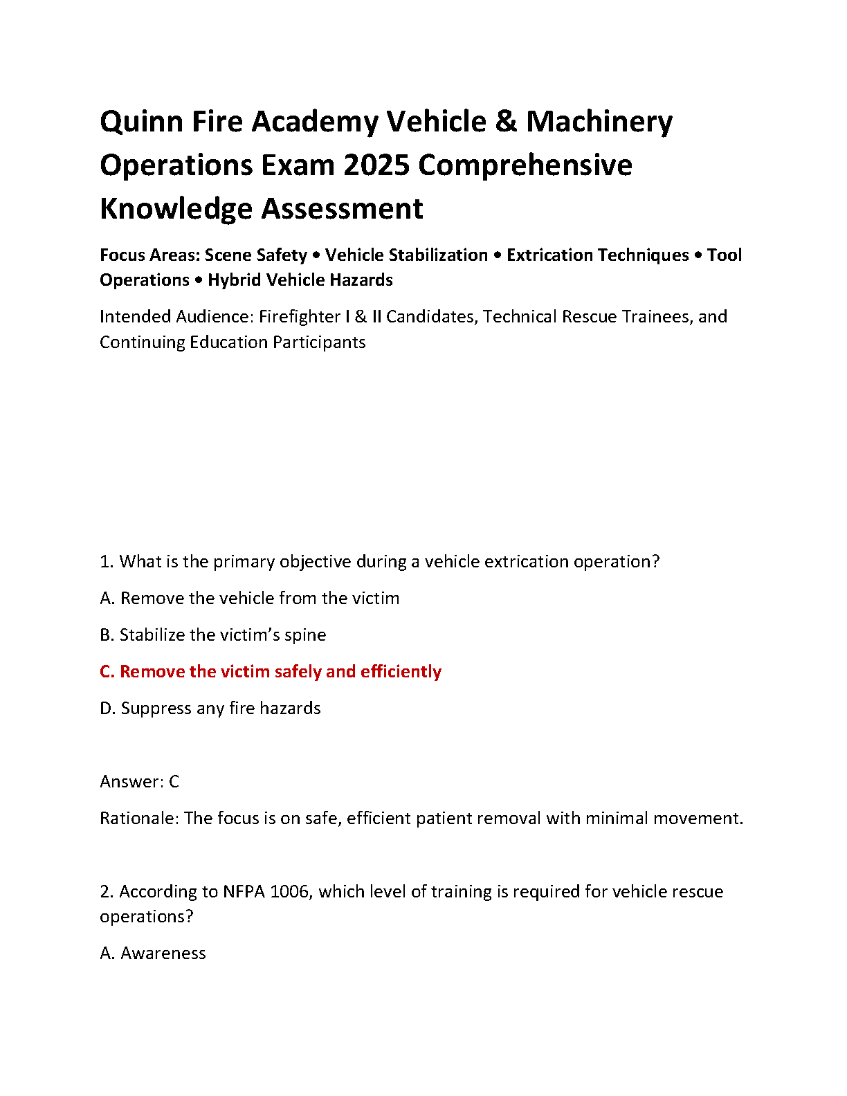 Ace the Quinn Fire Academy Vehicle & Machinery Operations Exam 2025 with this comprehensive knowledge assessment. This resource covers key areas like scene safety, vehicle stabilization, extrication techniques, tool operations, and hybrid vehicle hazards, ensuring you're prepared for exam success on your first attempt. Ideal for Firefighter I & II candidates, technical rescue trainees, and continuing education participants.