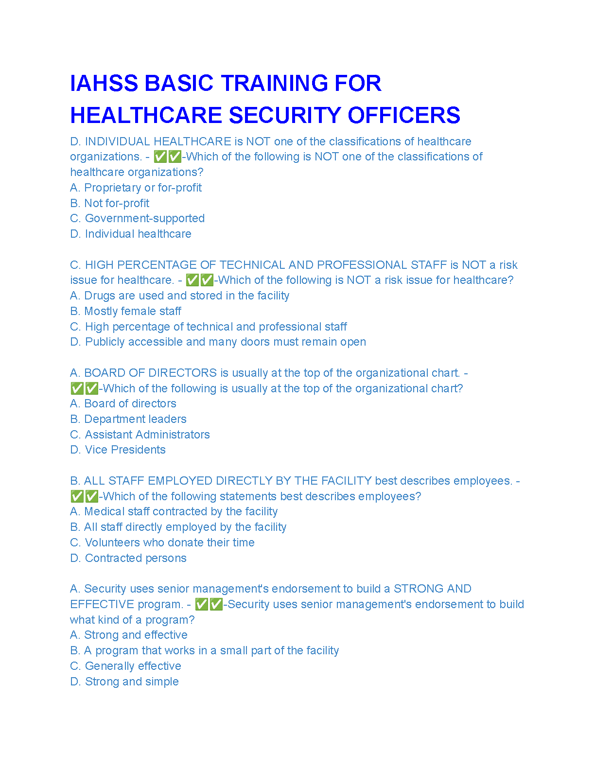 Ace your IAHSS Healthcare Security Officer exam on your first try! This comprehensive guide provides in-depth study material covering key topics such as healthcare organization classifications, risk assessment, organizational structure, and effective security program development. Designed for the 2024/2025 academic year, this resource helps students avoid resits and achieve exam success.