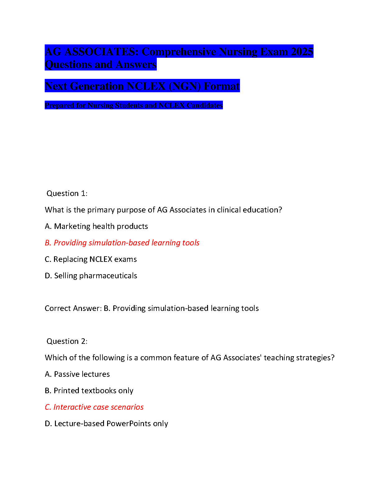 AG Associates: Comprehensive Nursing Exam 2025 Questions and Answers - Next Generation NCLEX (NGN) Format
