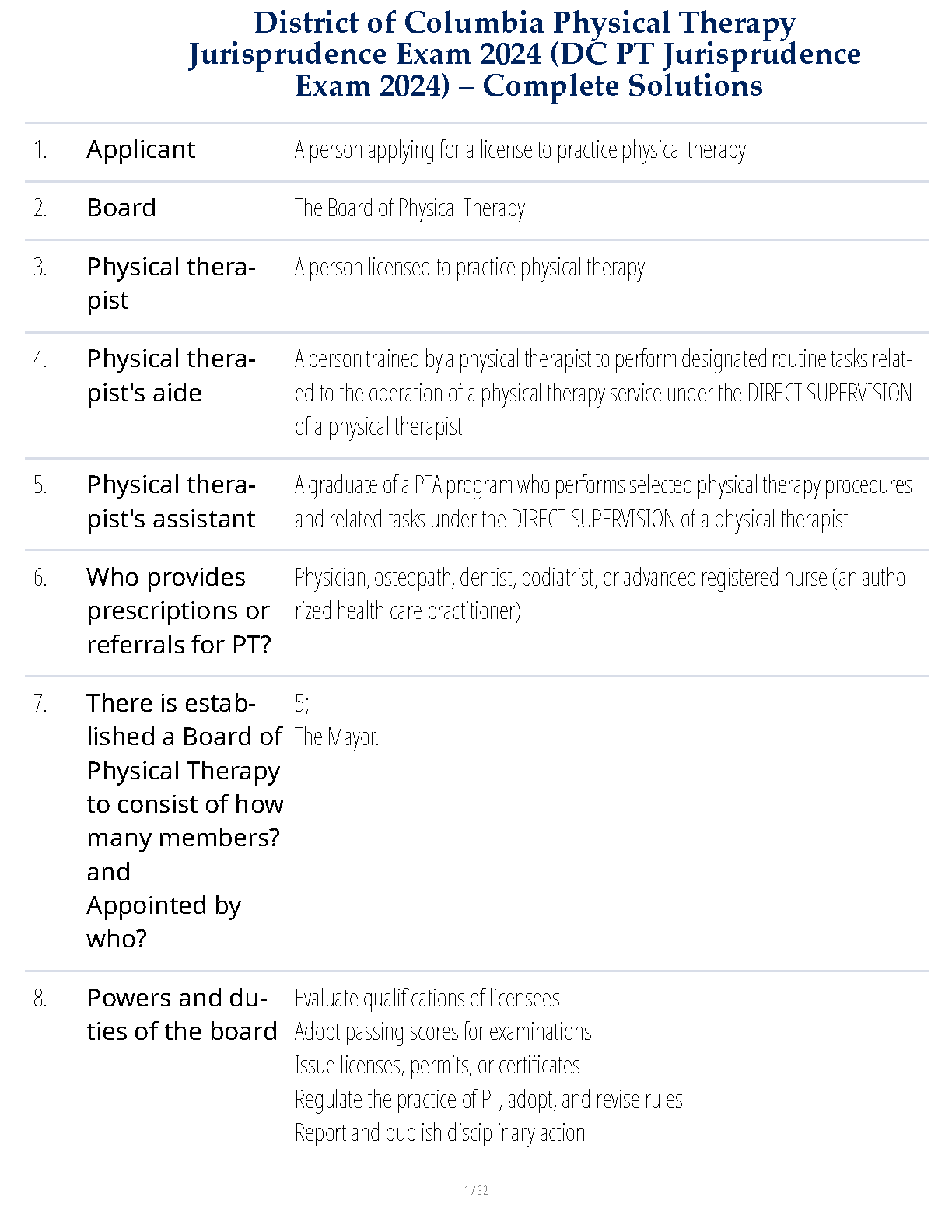 Ace your District of Columbia Physical Therapy Jurisprudence Exam (2024) on the first try with this comprehensive solution guide. Covering key concepts and providing complete answers, this resource is designed to help students avoid resits and achieve exam success.