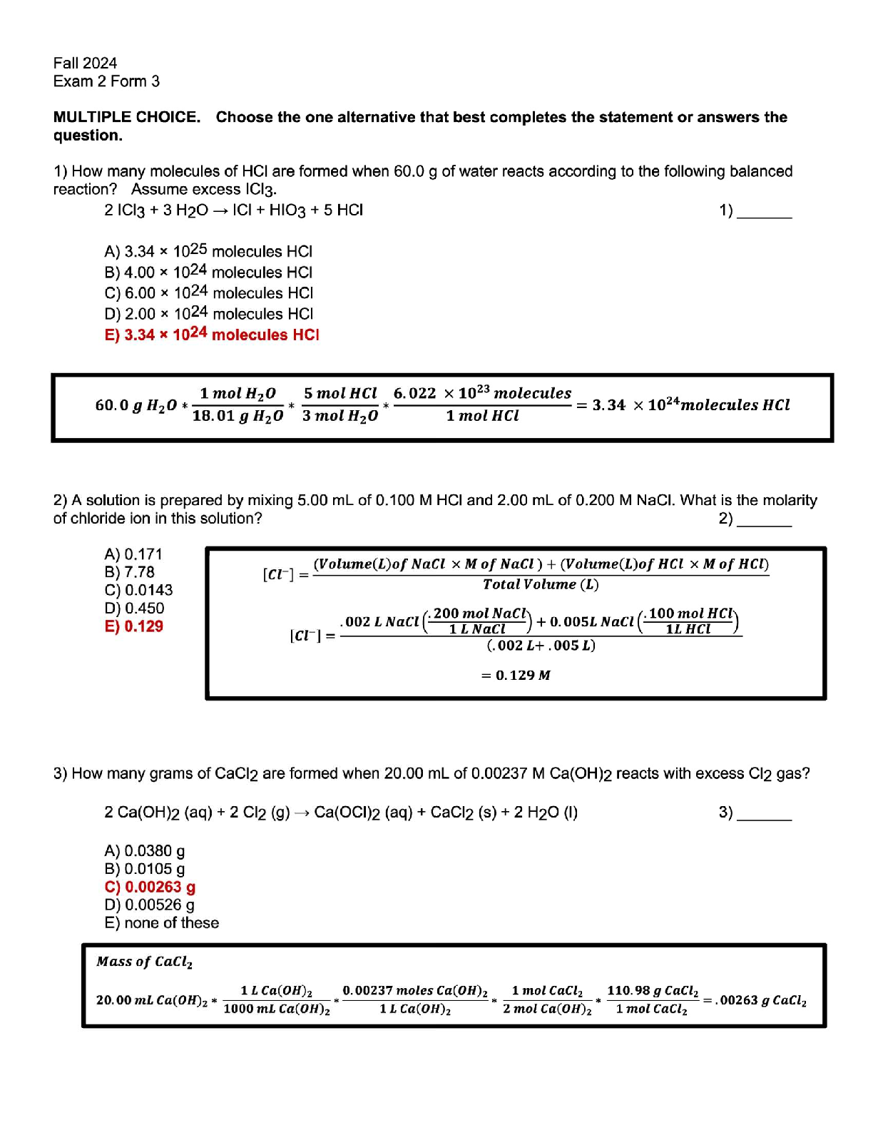 Fall 2024 Exam 2 Form 3: Chemistry Multiple Choice Questions and Solutions