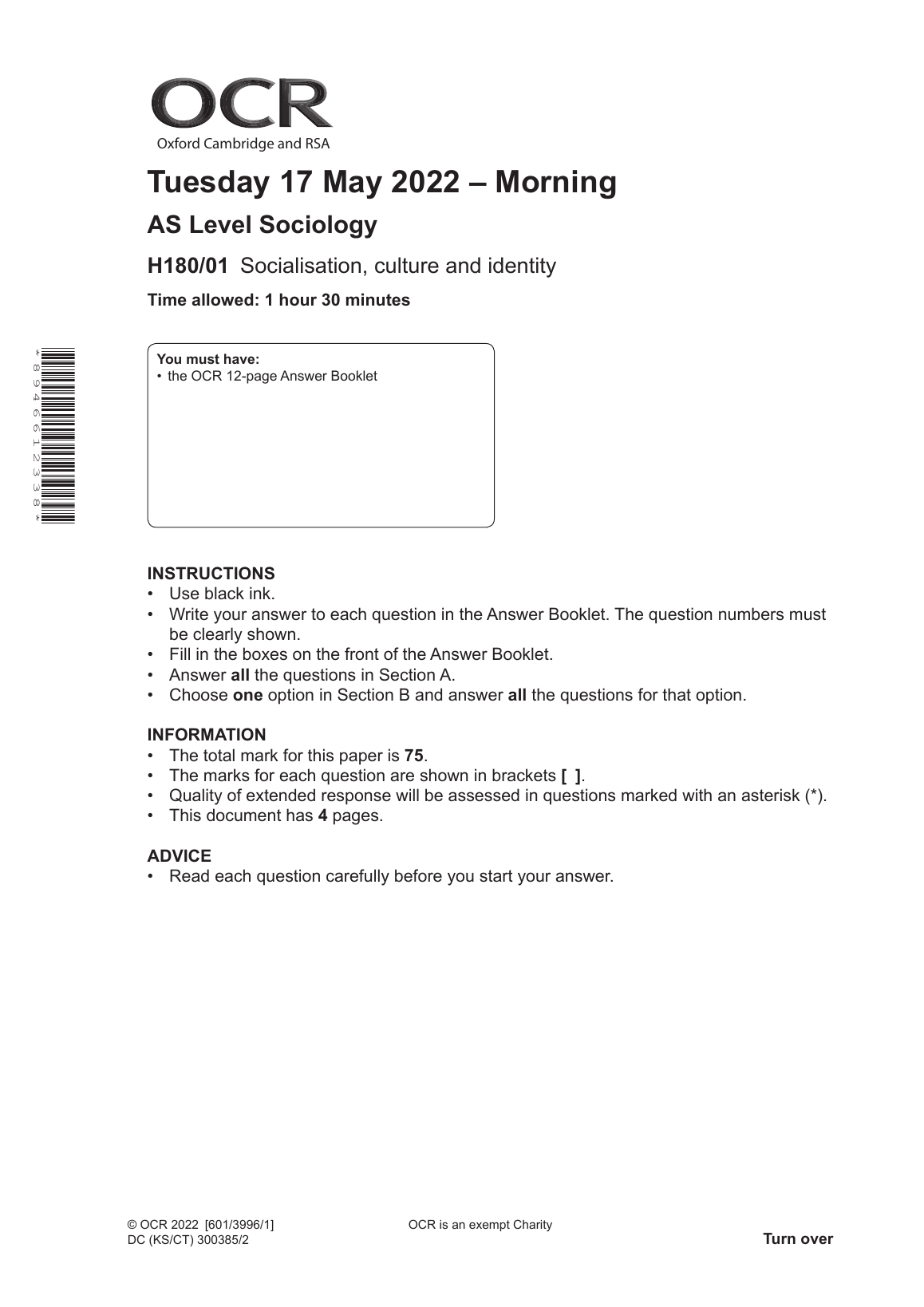 OCR AS LEVEL SOCIOLOGY PAPER 1 MAY 2022 QUESTION PAPER (H180/01: Socialisation, culture and identity)