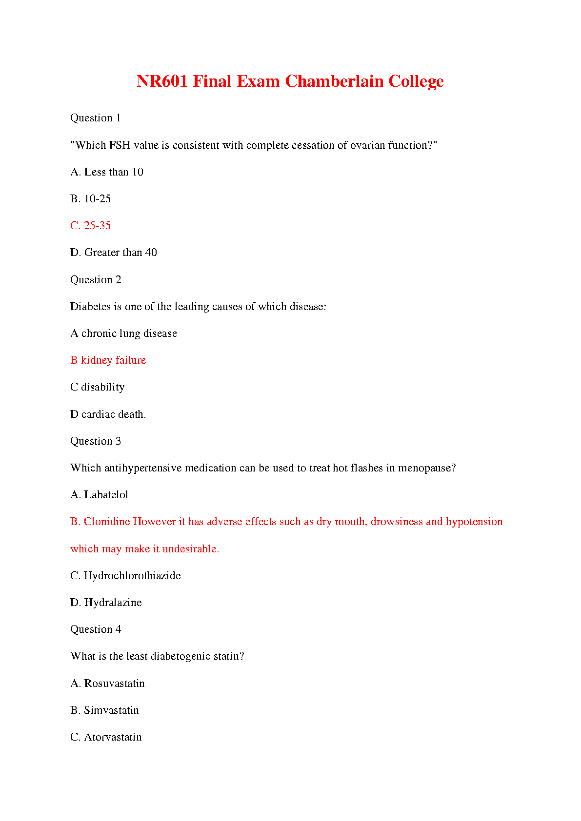Ace your NR601 final exam at Chamberlain College with this comprehensive question and answer resource. Prepare for success and avoid resits with these practice questions covering key concepts. Ideal for students aiming to pass their exams on the first attempt.