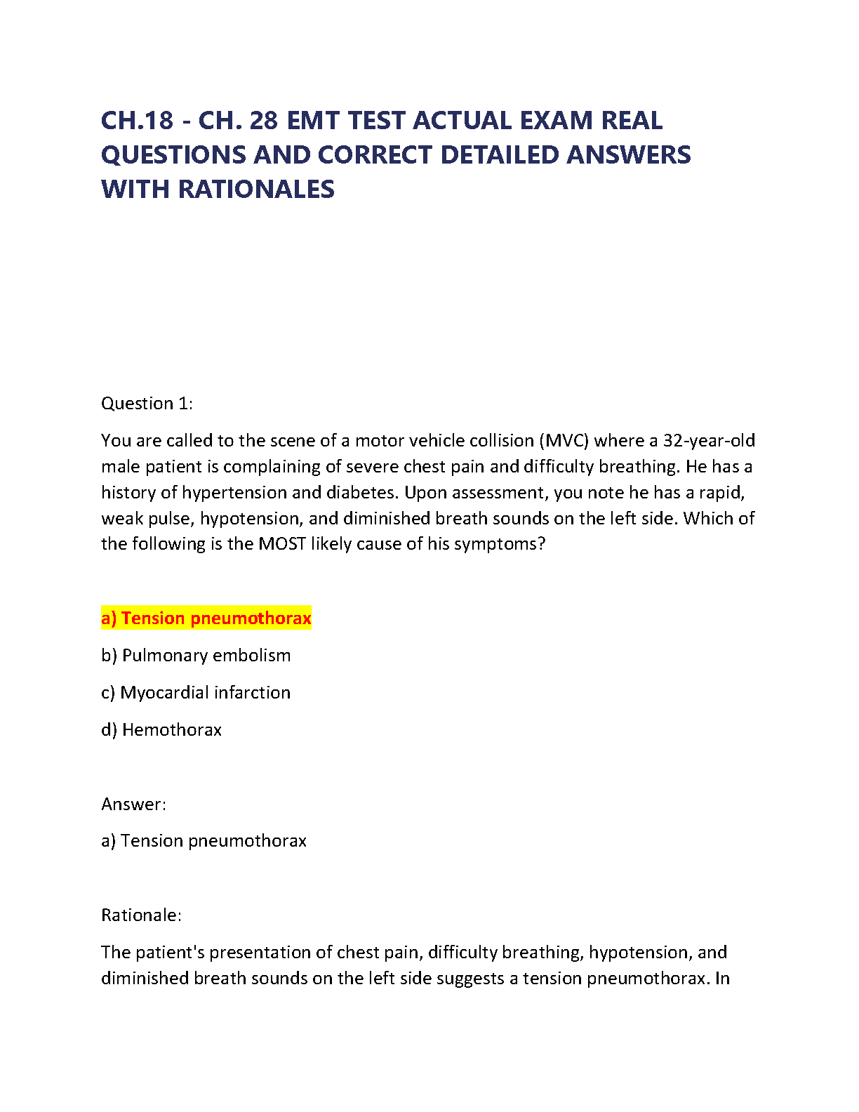Ace your EMT exam with this comprehensive collection of real exam questions and detailed answers. This resource covers Chapters 18-28 and includes rationales to help you understand the underlying concepts and improve your critical thinking skills. Perfect for first-time test takers aiming to pass with flying colors and avoid resits.