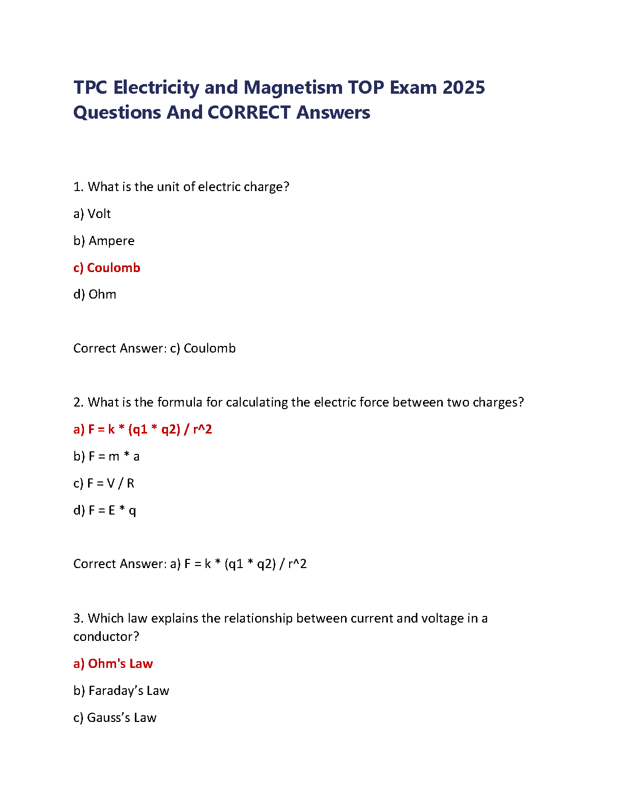 Ace your TPC Electricity and Magnetism exam with this comprehensive question and answer guide. Prepare effectively and avoid resits with our 2024/2025 edition. This resource is designed to help students pass their exams on their first attempt by providing detailed explanations and solutions.