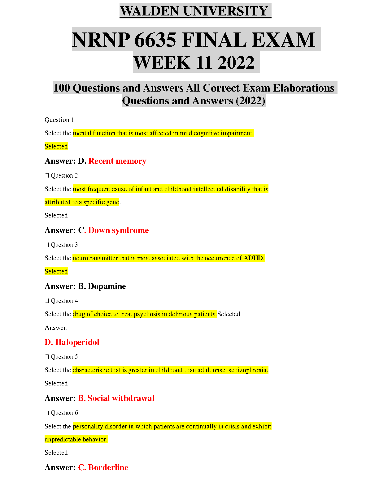 WALDEN UNIVERSITY NRNP 6635 FINAL EXAM WEEK 11 Questions and Answers All Correct Exam Elaborations Questions and Answers (2023)