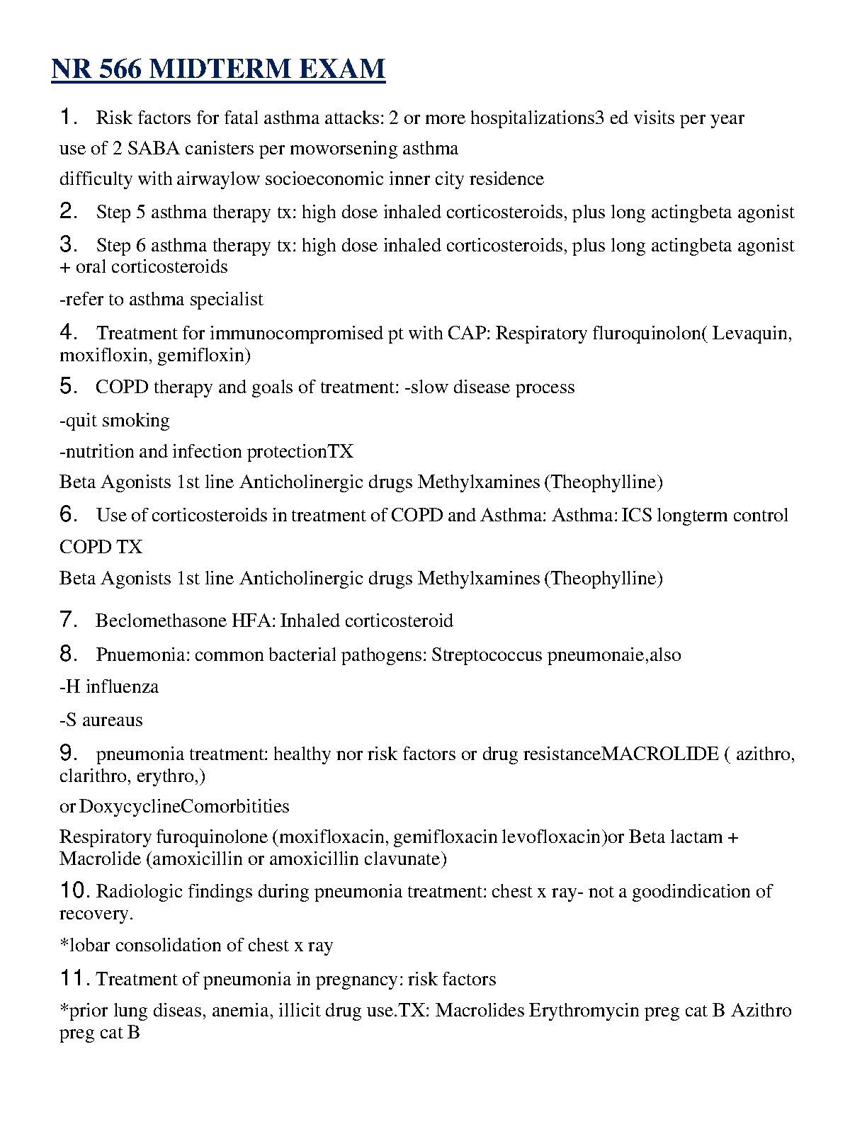 Ace your NR 566 midterm exam on your first attempt with this comprehensive study guide. Covering key concepts in asthma, COPD, and pneumonia management, including treatment protocols, risk factors, and drug choices. This guide is designed to help students avoid resits and achieve exam mastery.