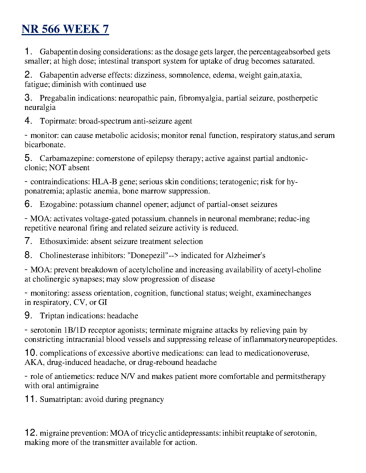 Ace your NR 566 exam with this comprehensive study guide covering key neuropharmacology concepts. This resource is designed to help students understand the material thoroughly and achieve exam success on their first attempt, avoiding resits. Topics include gabapentin, pregabalin, topiramate, carbamazepine, ezogabine, ethosuximide, cholinesterase inhibitors, triptans, and more. Master the material and conquer your exams!