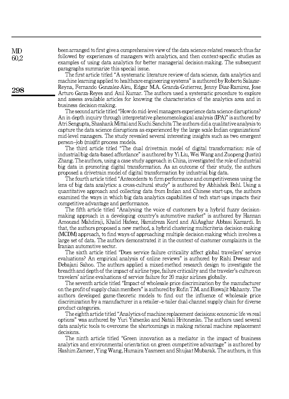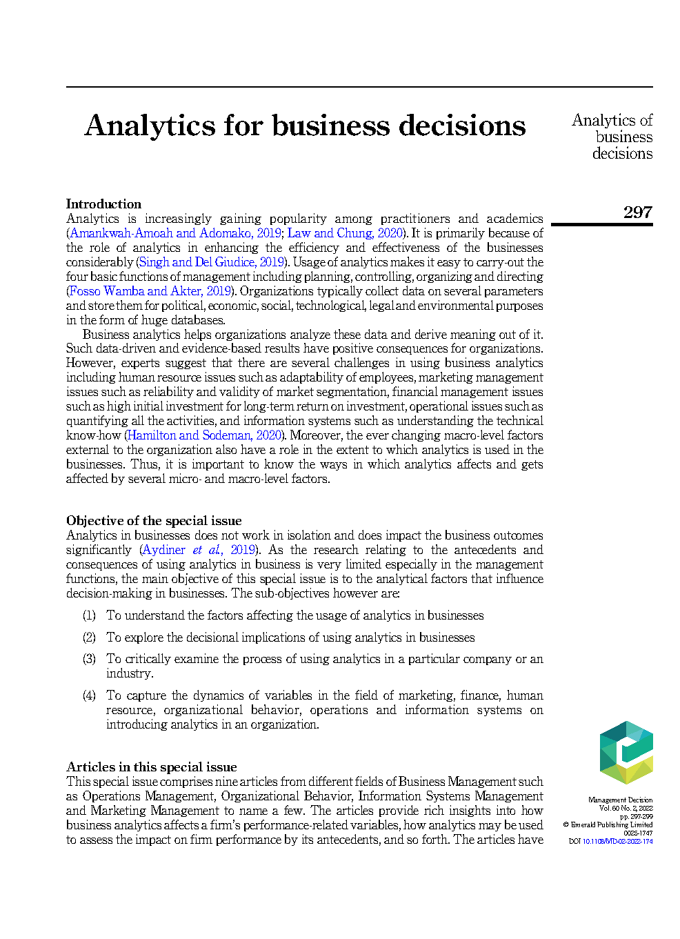 Access the Volume 60, Number 2, 2022 edition of Management Decision, focusing on Analytics for Business Decisions. Edited by Manish Gupta, Weiguo Fan, and Aviral Kumar Tiwari, this resource delves into cutting-edge analytical approaches for strategic business decision-making. Ideal for students and professionals seeking to enhance their understanding of data-driven insights for improved business outcomes.