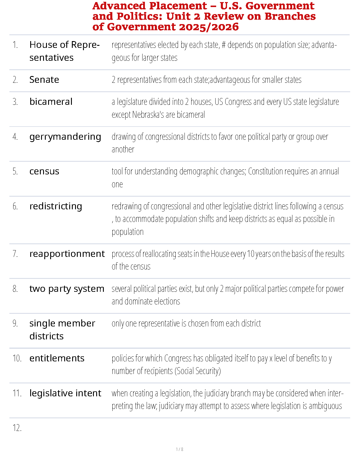 Ace your Advanced Placement U.S. Government and Politics exams with this comprehensive study guide covering Unit 2: Review on Branches of Government. Designed for the 2024/2025 academic year, this resource helps you understand key concepts and pass on your first attempt, avoiding resits. Master topics like gerrymandering, census, redistricting, and more.
