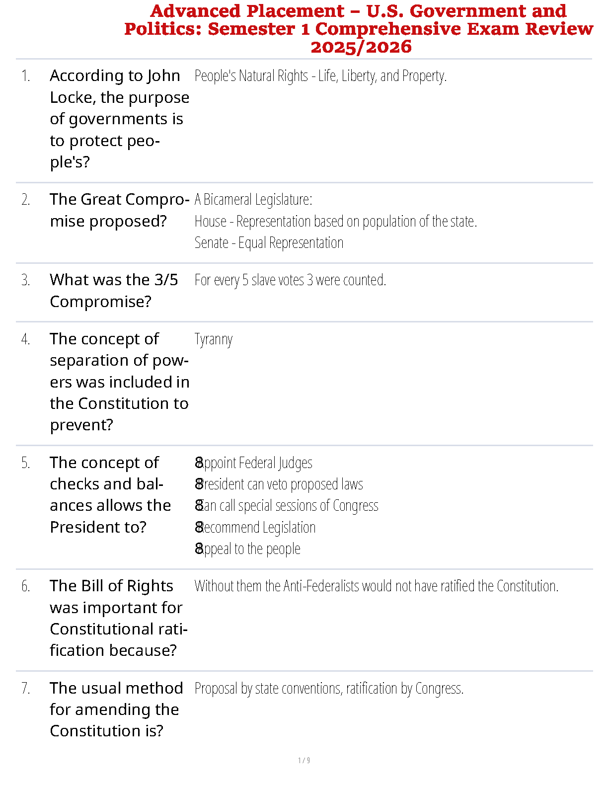 Advanced Placement US Government and Politics: Semester 1 Comprehensive Exam Review 2025/2026 - Exam Prep Guide