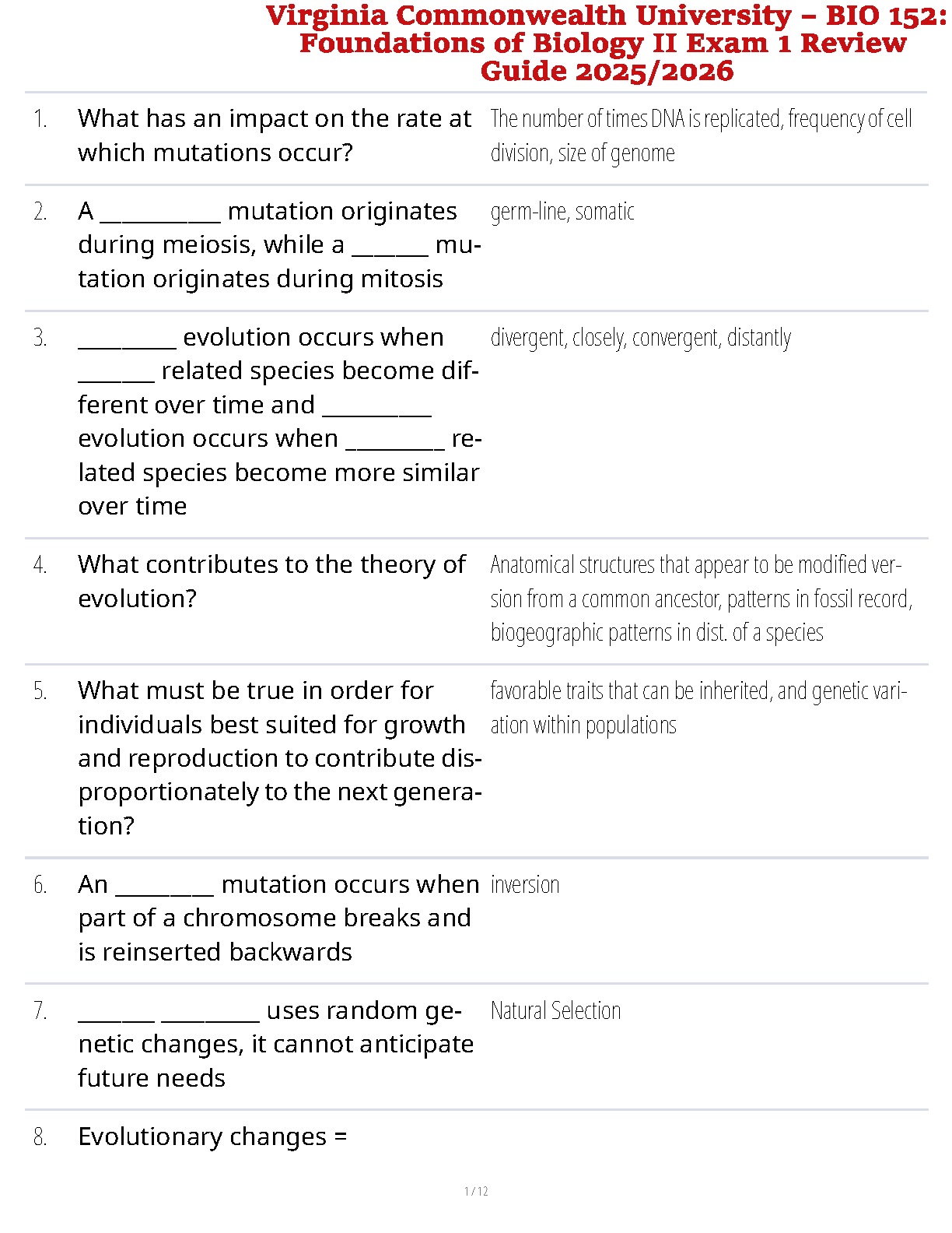 BIO 152 Foundations of Biology II Exam 1 Review Guide 2025/2026 - Virginia Commonwealth University