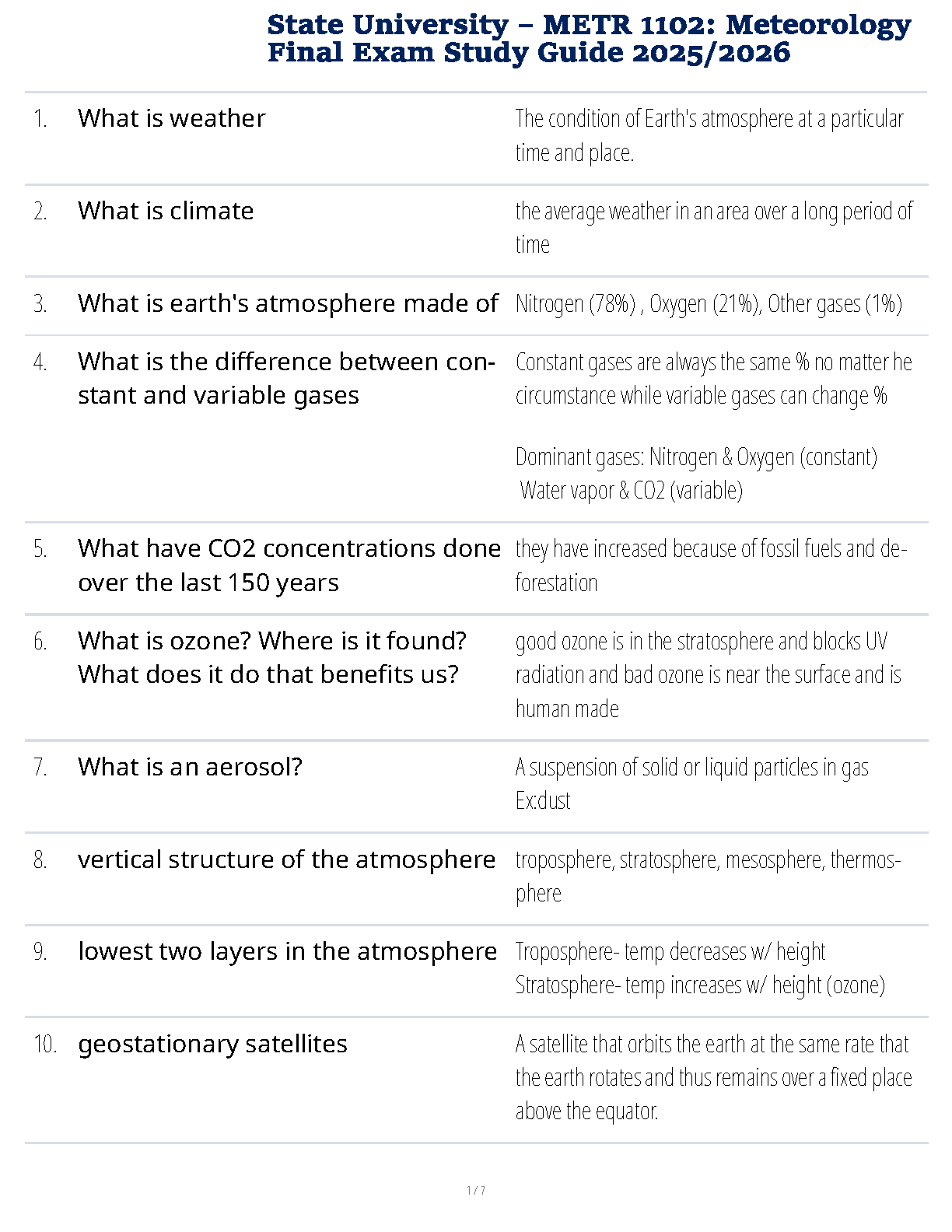 Conquer your State University METR 1102: Meteorology final exam with this comprehensive study guide designed for the 2025/2026 academic year. Master key concepts, definitions, and processes to achieve exam success and avoid resits. This resource covers weather, climate, atmospheric composition, ozone, aerosols, and more.
