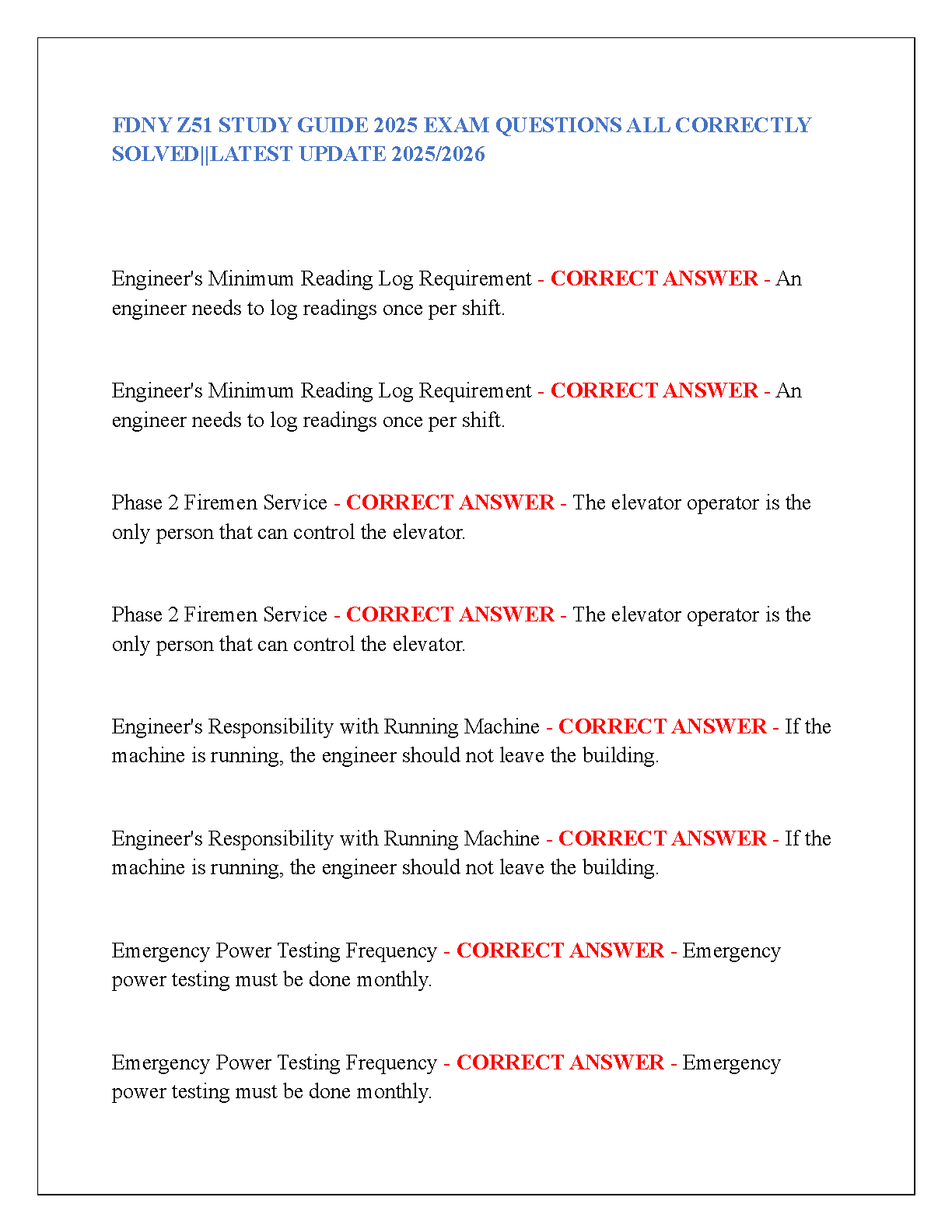 Ace your FDNY Z51 exam on the first try with this comprehensive study guide, featuring all correctly solved 2025 exam questions. This updated resource covers key topics such as engineer's minimum reading logs, fireman service procedures, and emergency power testing frequencies. Ensure exam success with this essential preparation tool.