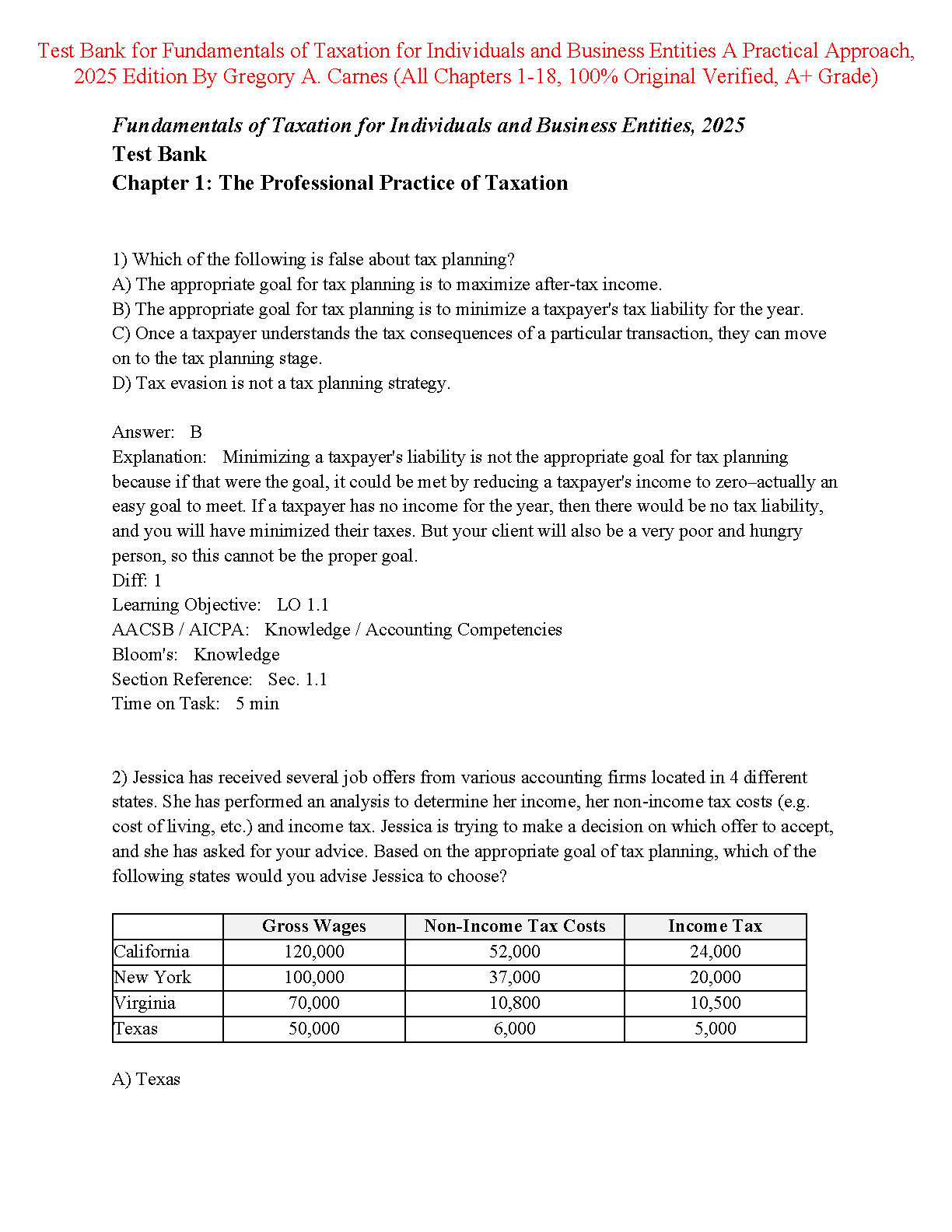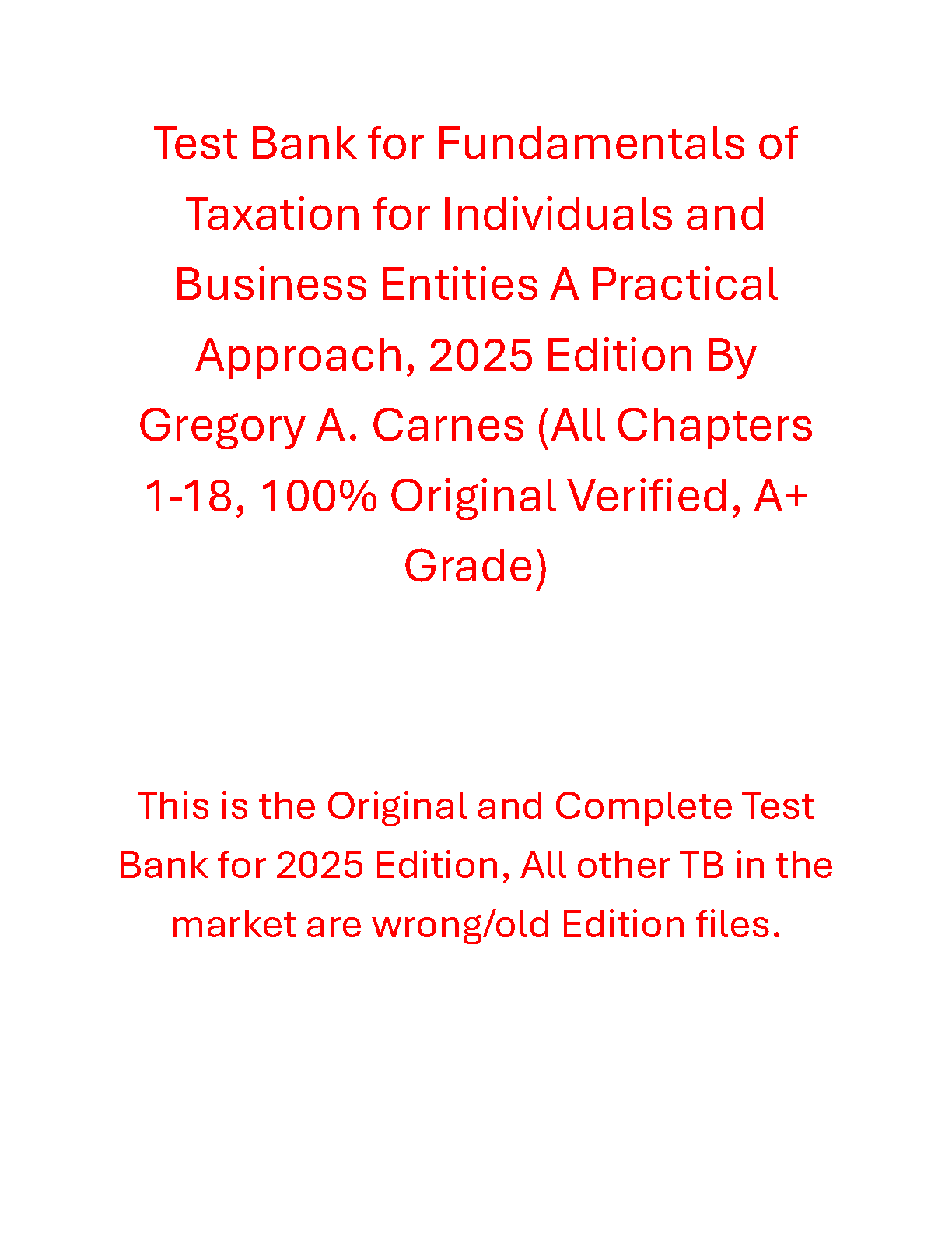 Ace your Fundamentals of Taxation exam with this complete and verified test bank for the 2025 edition by Gregory A. Carnes. Covering all chapters (1-18), this resource ensures you're prepared for exam day and avoid resits. 100% original and accurate, unlike outdated versions found elsewhere.