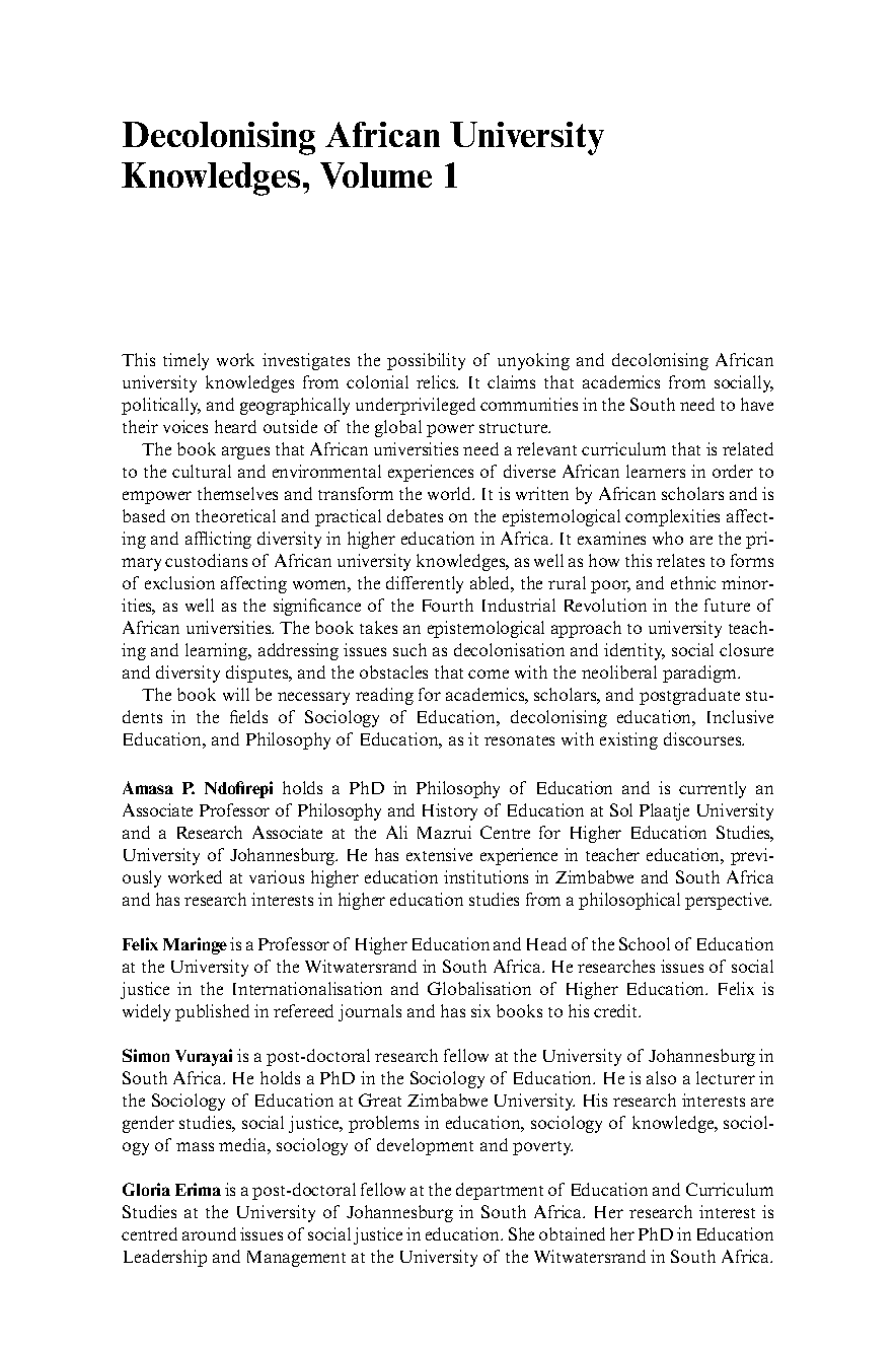 Explore the complexities of decolonizing African university knowledge systems in this insightful volume, edited by leading scholars in the field. This first volume in the series delves into the diverse voices and perspectives that shape the discourse on inclusivity and pluralistic approaches within higher education. A must-read for researchers, educators, and students engaged with postcolonial studies, African studies, and higher education reform.