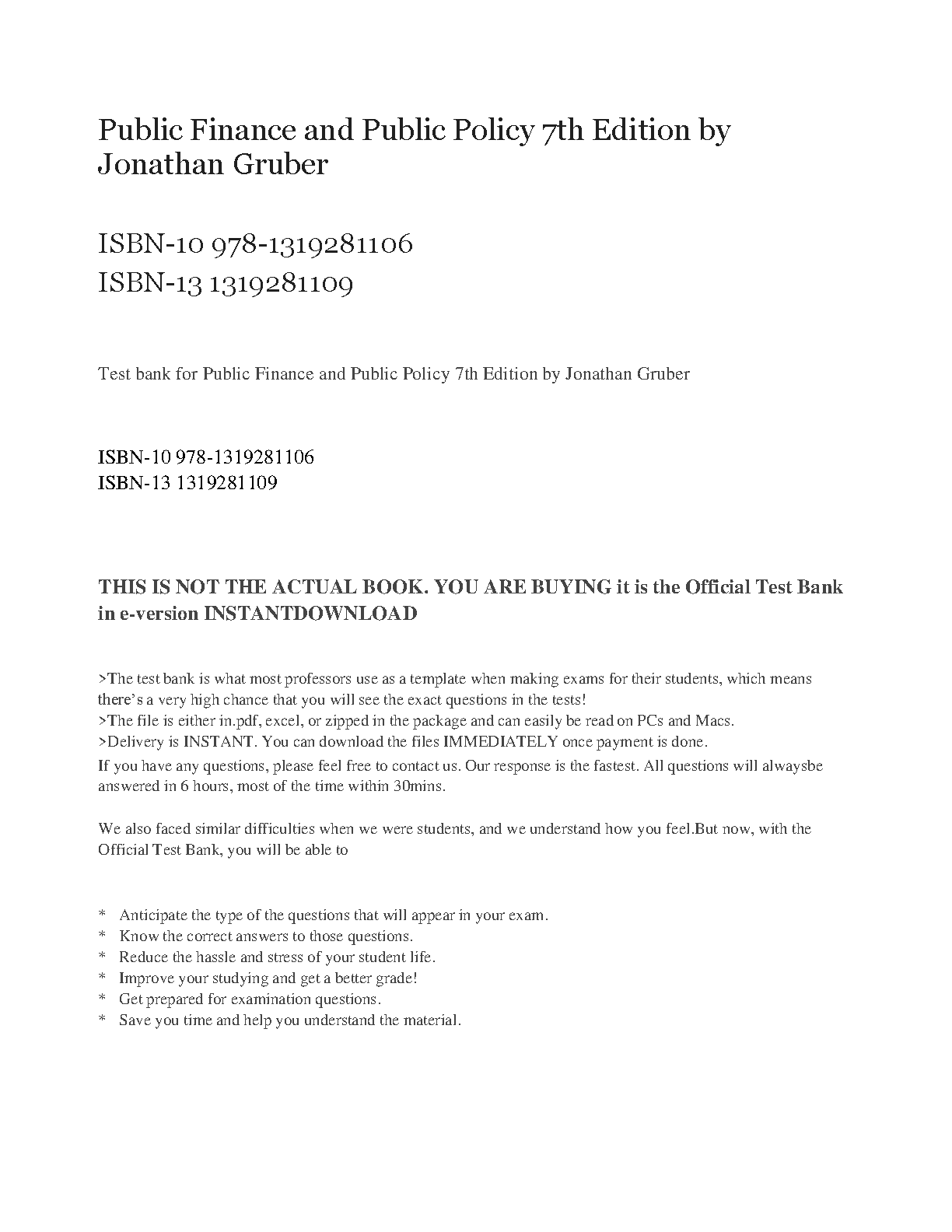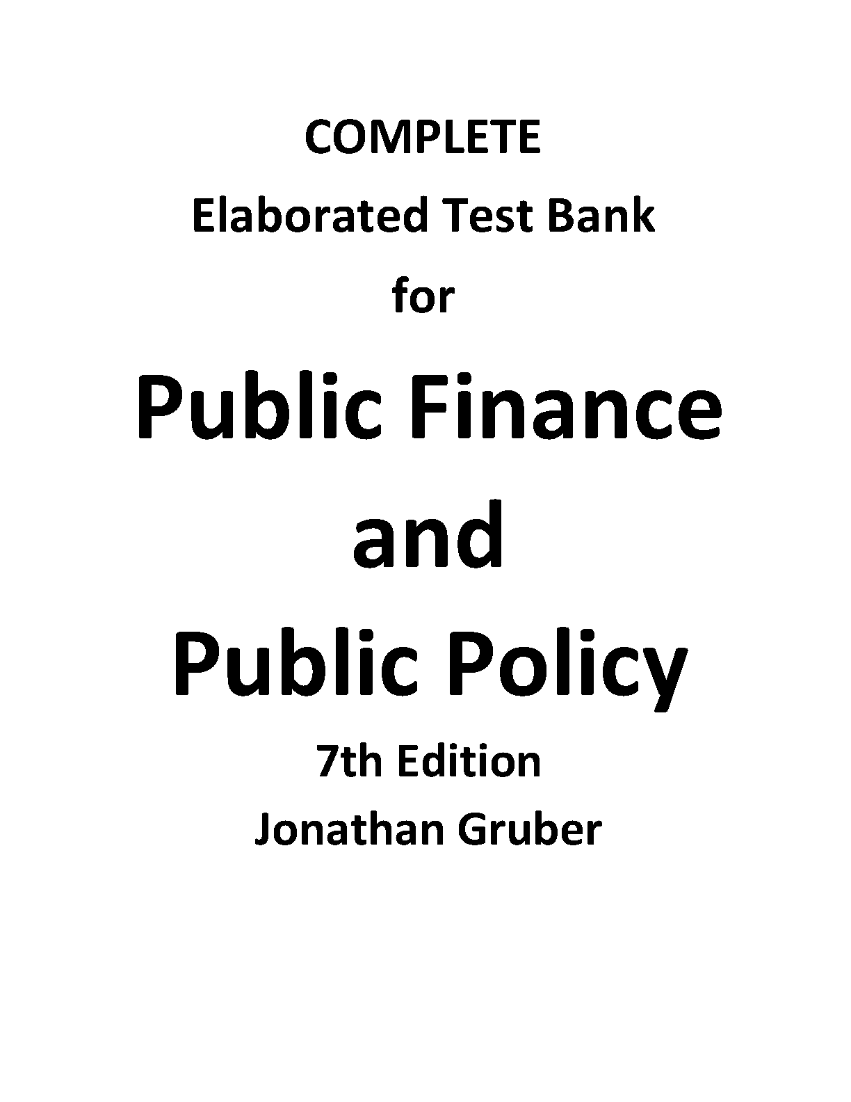 Ace your Public Finance and Public Policy exam with this comprehensive test bank for the 7th edition by Jonathan Gruber. This resource provides a wealth of practice questions to help you master the material and achieve exam success on your first try. Prepare effectively and avoid resits!