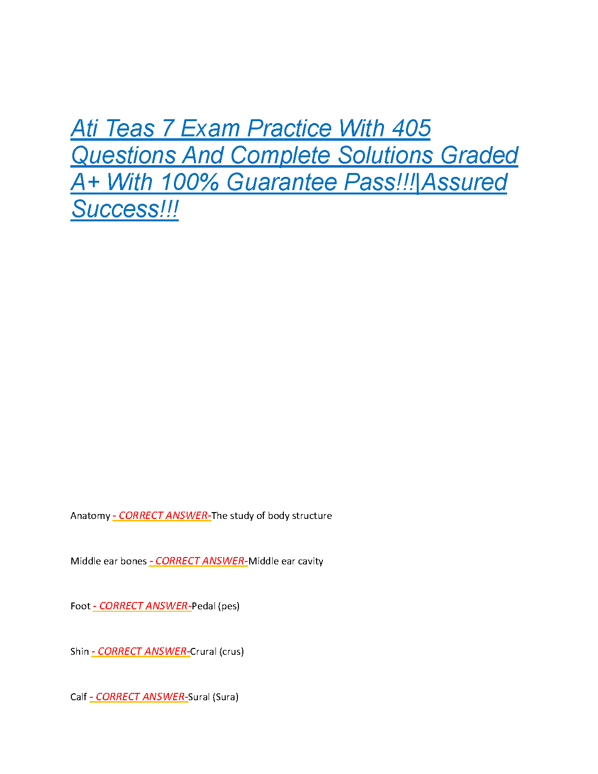 Ace your ATI TEAS 7 exam on your first try with this comprehensive practice resource. Featuring 405 graded questions with complete solutions, this guide guarantees success and helps you avoid costly resits. Prepare effectively for the 2024-2025 academic year.