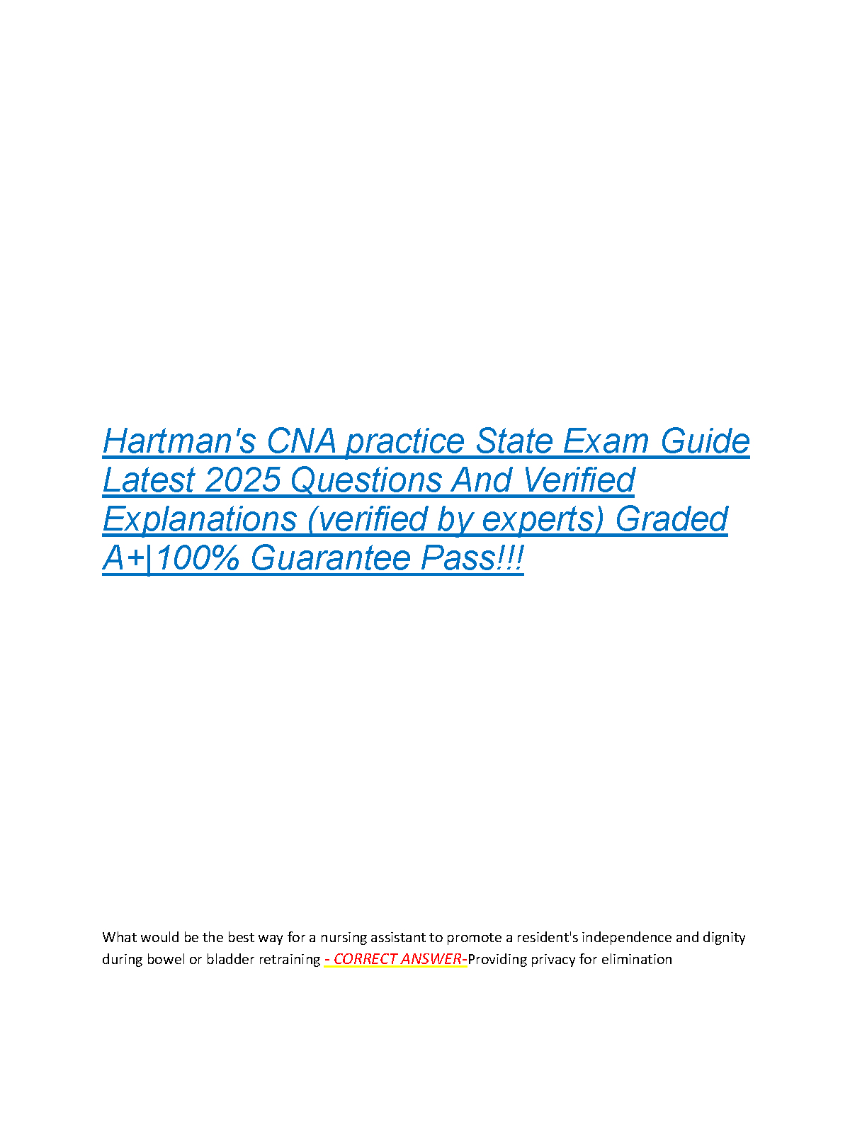 Hartman's CNA Practice State Exam Guide: Latest 2025 Questions & Verified Answers for a Guaranteed Pass