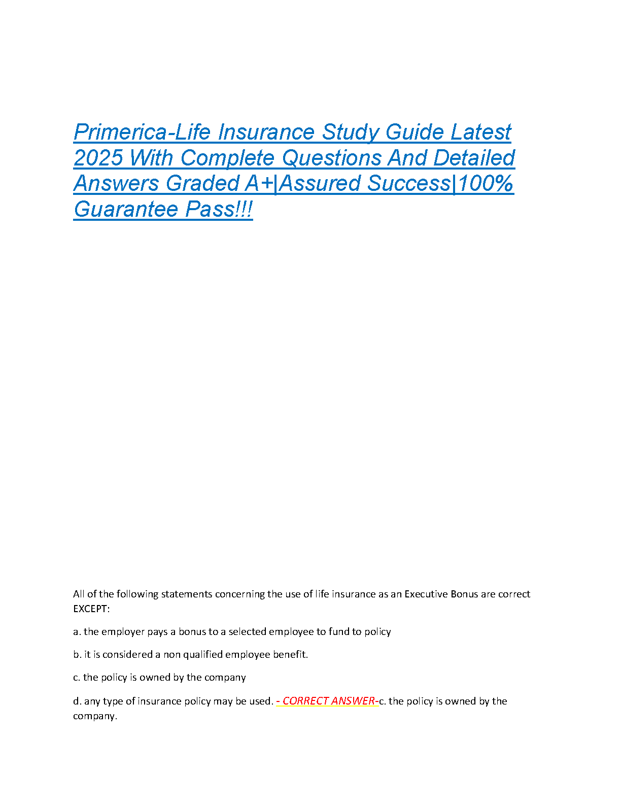 Conquer your Primerica Life Insurance exam with this comprehensive 2025 study guide. Featuring detailed explanations and A+ graded answers, this resource guarantees success and helps you avoid resits. Get access to complete questions and answers that prepare you for exam day.