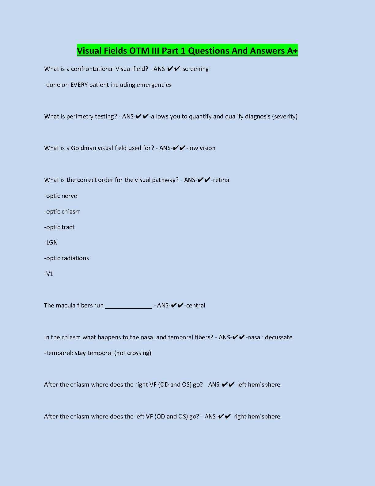 Visual Fields OTM III Part 1 Questions and Answers A+ - Complete Guide for Exams