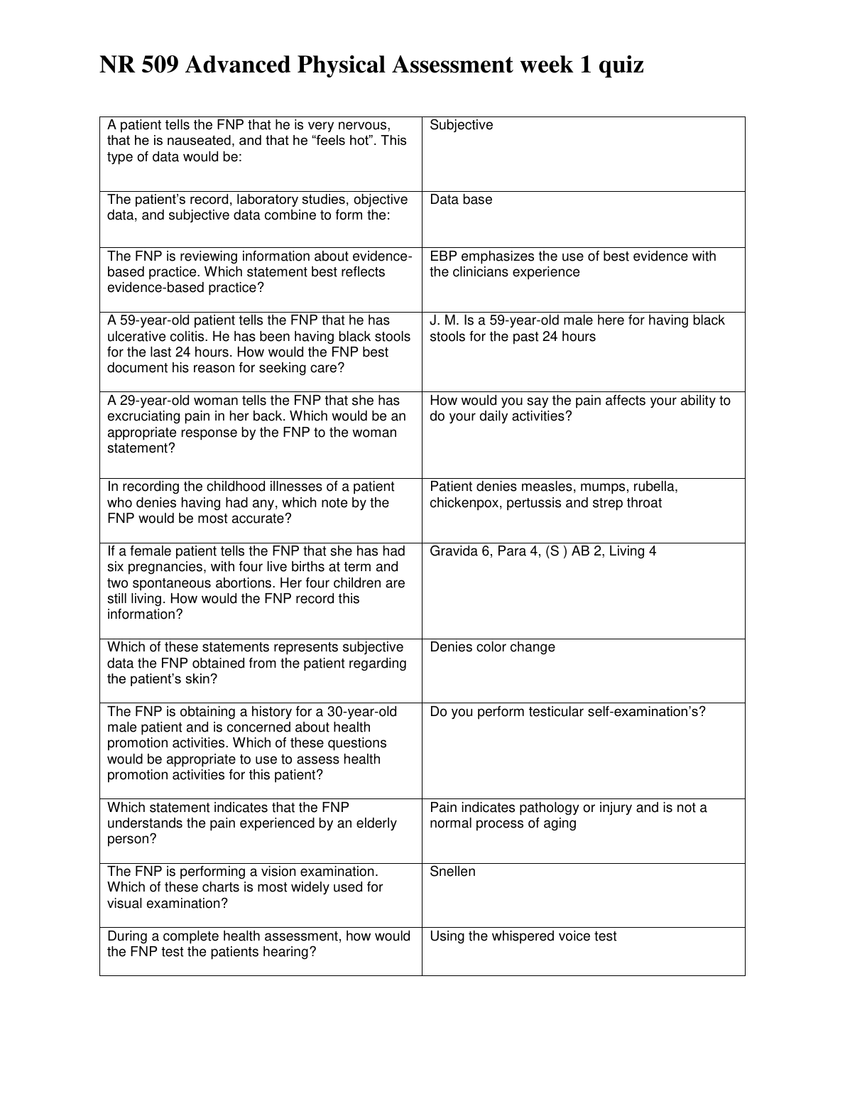 NR 509 Advanced Physical Assessment week 1 quiz WITH CORRECT ANSWERS RATED A+